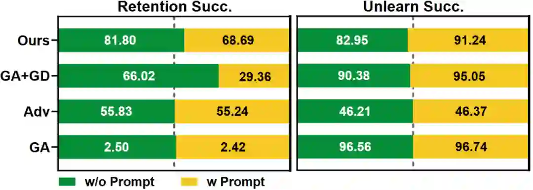 知识擦除的鲁棒性分析:我们通过在问题前拼接简单的提示检验知识擦除的鲁棒性,可以发现相比于GA类方法的明显下降,MemFlex具有较高的稳定性。同时,使用RoBERTa分类器区分擦除范围时,在添加简单的提示后擦除成功率下降,表明分类器缺乏鲁棒性。