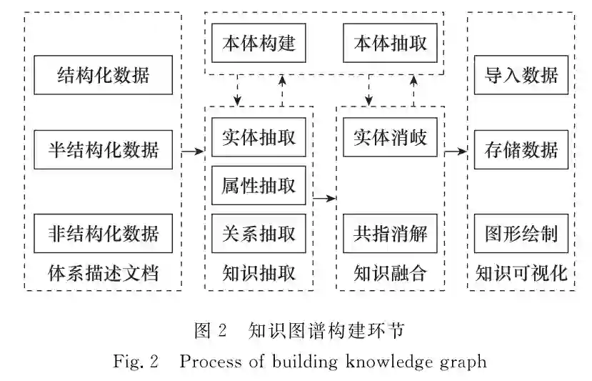 针对当前军事领域知识图谱描述装备体系存在的数据规范程度不高、实体不统一和实体关系不一致等问题, 提出一种基于元模型的军事领域本体模型构建方法。该方法采用体系架构元模型技术框架下的概念数据模型和逻辑数据模型定义装备体系本体, 从而生成装备体系知识图谱, 避免不同兵种、不同业务领域装备体系本体不一致的影响。选取协同打击任务场景构建无人机集群装备体系应用本体, 导入Neo4j软件生成知识图谱。结果表明, 所提方法能够满足装备体系知识图谱构建需求。 体系对抗是现代战争的基本对抗形式, 体系建设关系到战争的胜败。装备体系作为作战体系的重要物质基础和能力支撑, 其建设发展质量直接影响作战体系效能发挥。近年来, 在高新技术的推动下, 国外先后提出了马赛克战、多域战和分布式作战等一系列作战概念, 装备体系的复杂程度逐渐增加, 体系要素类型日趋庞大, 系统交互更加密集[1]。如何构建和运用要素复杂、数据密集和信息耦合的装备体系, 支撑作战需求实现, 已经成为装备建设发展的重要课题。 知识图谱借助图形学、应用数学实现信息可视化, 以可视化的图形直观展示知识内容, 在医学、金融和智能搜索等领域取得较快发展。在军事领域, 运用知识图谱可以清晰显示装备体系的系统组成、关系和属性, 为装备体系的发展论证、运用和分析提供重要支撑。知识本体作为知识描述框架, 是知识图谱的基础, 国内外很多学者对本体构建开展了相关研究。文献[2]基于生物医学本体构建了新型冠状病毒知识图谱, 用以存储和管理病毒知识。文献[3]提出一种利用生物概念互联本体构建生命科学不同子领域知识图谱的方法, 破解概念间关系跨越不同子领域的难题。文献[4]介绍了一种动态本体构建技术, 用以描述语义物联网。文献[5]提出一种适合武器装备体系的本体构建方法, 构建武器装备体系知识图谱。文献[6]在对当前军事领域本体构建方法归纳总结的基础上, 提出了一套军事领域本体构建流程。文献[7]提出了一种基于开源和多维数据的军事领域知识图谱构建方法, 并描述了构建图谱的过程。 当前, 装备领域知识图谱的构建主要采取基于“采集领域军事语料+概念分析”的本体建模的方式, 构建的本体存在重用性不强, 知识图谱数据规范程度不高、概念不统一和关联关系不一致等问题, 且构建的图谱只能反映装备体系组成要素的静态关系, 无法有效展示装备体系基于任务的交互。针对以上问题, 本文提出一种基于元模型的装备领域本体构建方法, 采用体系架构元模型的概念数据模型和逻辑数据模型, 定义装备体系概念层次、属性及其关系, 构建装备体系领域本体模型; 结合装备体系要素构成和应用场景, 细化领域本体模型生成应用本体, 最终基于应用本体构建知识图谱。