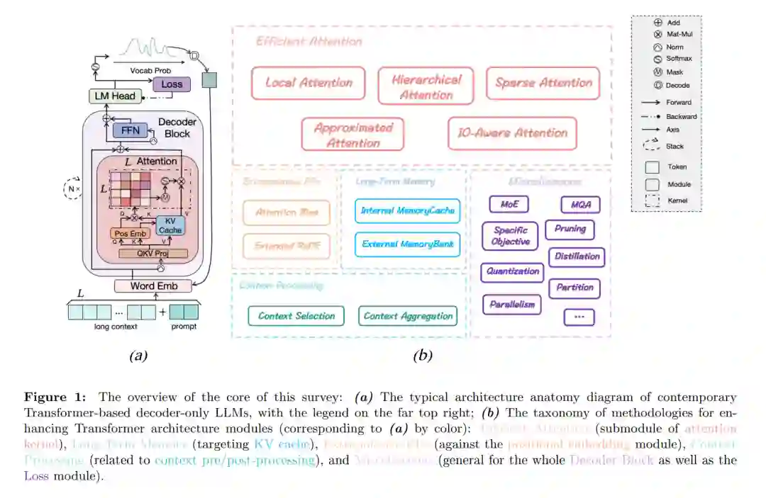 建立了一个全面的分类法,将Transformer架构分解为五部分,并探讨在每个阶段(包括预训练、微调、推理和预/后处理)增强长上下文LLMs的现有方法。