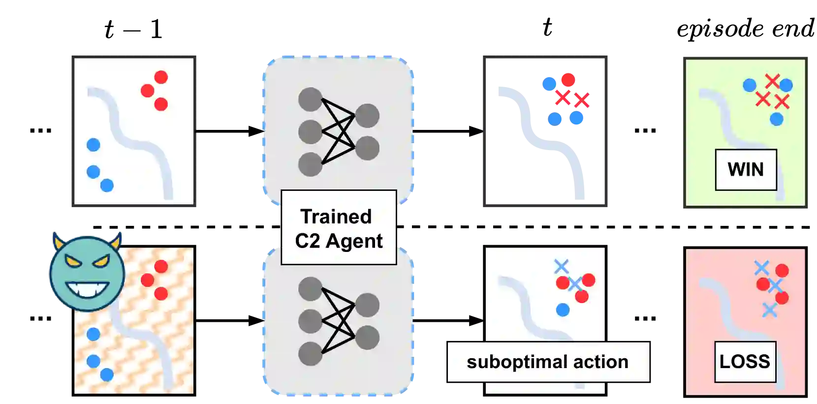 最新研究成果表明,通过强化学习技术和合成数据训练的 C2 智能体在赢得模拟兵棋推演方面取得了相当大的成功。这在一定程度上归功于 RL 训练的可扩展性,事实证明它在探索和利用不同策略方面具有巨大优势,即使面对困难或复杂的场景,并且只给定环境的部分信息时也是如此。然而,这些评估都是在良性环境下进行的,在这种环境下,C2 智能体可用的信息被假定为未被破坏。实际上,这在战场上是不太可能的,因为在战场上,由于信息的收集方式(来自传感器或其他来源),信息可能存在固有的噪音,或者可能被敌方篡改。在这项工作中,我们将评估这种训练有素的智能体在 C2 环境中受到潜在对抗性输入时的鲁棒性。