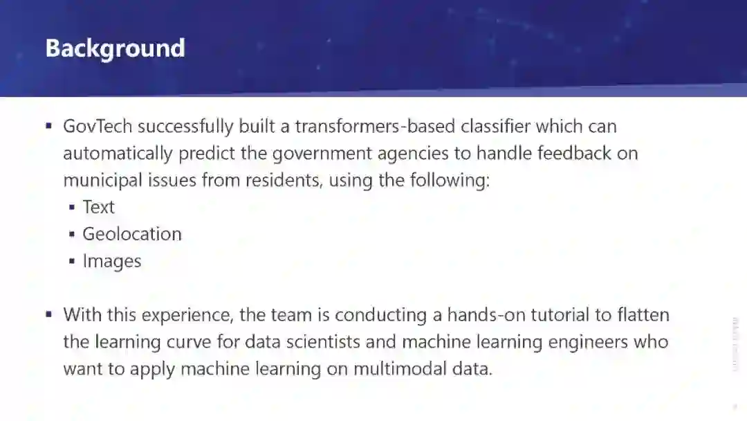 在我们的社会中,多模态数据的日益流行导致了对机器的需求增加,以全面地理解这些数据。然而,渴望研究此类数据的数据科学家和机器学习工程师面临着从现有教程中融合知识的挑战,这些教程通常单独处理每个模态。根据我们在新加坡政府对多模态城市问题反馈进行分类的经验,我们进行了一个手工教程,以希望将机器学习应用于多模态数据。 2021年,作为新加坡政府国家人工智能战略计划的一部分,新加坡政府技术机构(GovTech)的数据科学和人工智能部门(DSAID)构建了一个反馈分析引擎[1],根据市政问题反馈,该引擎可以预测: