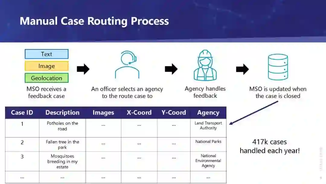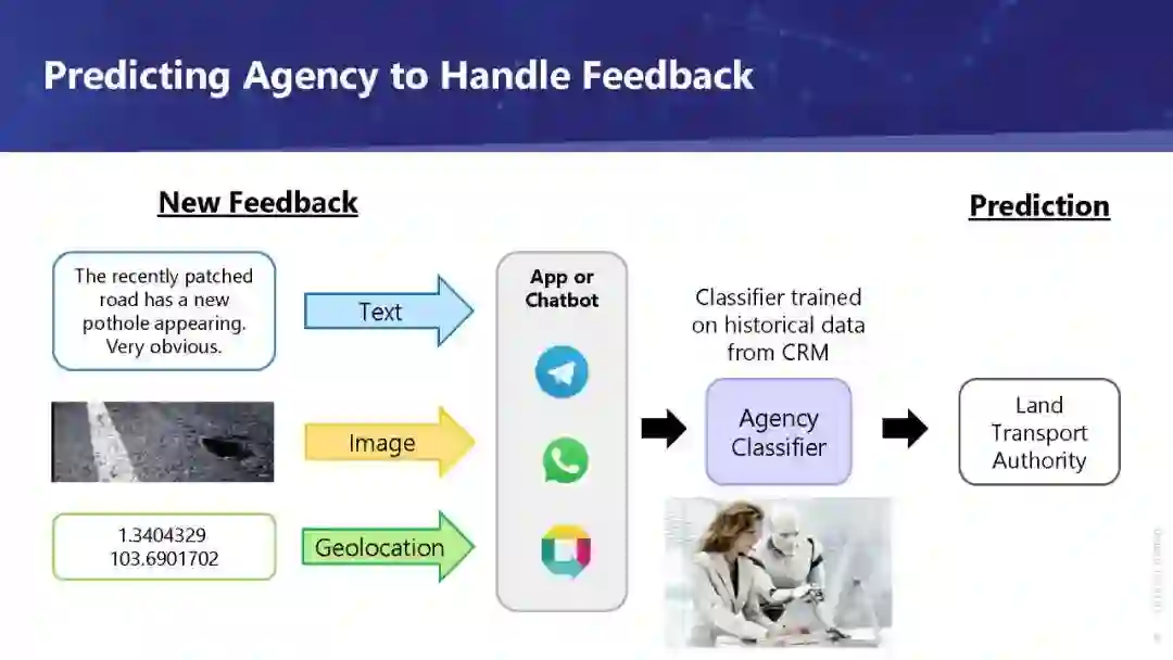 该引擎由基于历史数据的深度学习建立的分类模型组成,实现了良好的准确性,可以部署在OneService聊天机器人[2]中。创建这个引擎的最大挑战之一是处理多模态反馈数据,这些数据包括: (1)文本:对问题的描述, (2)地理位置:问题发生的位置,以及 (3) 图片:补充文字描述的图片。