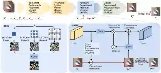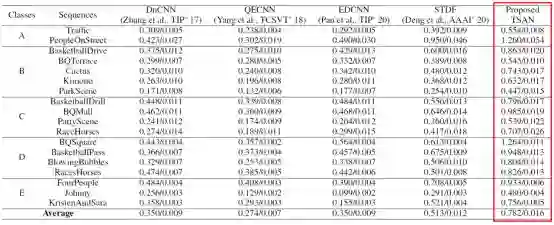 考率到转码压缩视频中存在的伪影是多次编码失真的叠加,先前的处理方案主要针对单次压缩损伤的修复,如图3所示,当其应用于转码视频上效果大打折扣。为此,结合实际应用场景,该论文将深度学习与转码视频去伪影任务相结合,利用转码视频特性,将初始编码信息作为中间辅助监督标签,设计辅助监督和全局监督损失函数引导网络训练。同时,该论文结合视频的时空相关特性设计了包括时域可变形对齐模块(TDAM)、金字塔空域融合模块(PSFM)等在内的卷积神经网络架构,并协同辅助监督(ASAM)和全局监督(GSAM)训练以更好地提升转码视频的画面质量,对应网络架构图见图4。因此,通过论文方法,可以在不增加视频码率的情况下大幅提高视频图像质量。表1以图像客观评价指标PSNR/SSIM增益作为客观评价指标衡量该论文方法较先前方法而言的增强性能提升程度。从