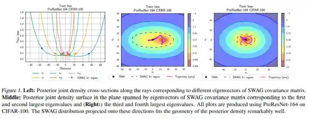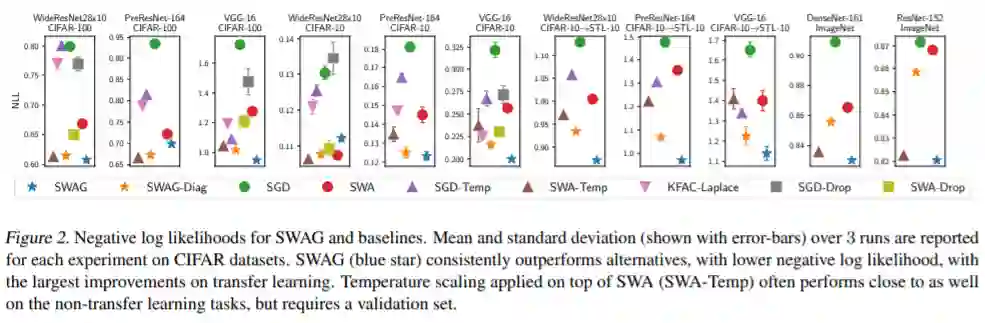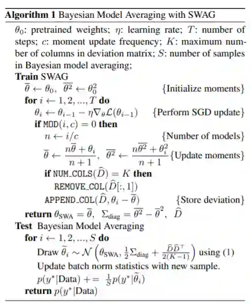 本文提出了一种简单、可扩展、通用的面向深度学习的不确定性表示和标定方法SWA-Gaussian (SWAG)。随机加权平均(SWA)是一种计算随机梯度下降(SGD)的第一次迭代的改进学习速率调度方法,最近被证明可以提高深度学习的泛化能力。在SWAG中,我们以SWA解作为第一个矩来拟合高斯分布,并从SGD迭代中得到一个低秩加对角协方差,形成了一个近似的后验分布;然后我们从这个高斯分布中取样,进行贝叶斯模型平均。根据SGD迭代的平稳分布结果,我们发现SWAG近似真实后验的形状。此外,我们证明了SWAG在各种计算机视觉任务上表现良好,包括样本外检测、校准和迁移学习,与许多流行的替代方案相比,包括MC dropout、KFAC拉普拉斯和温度标度。