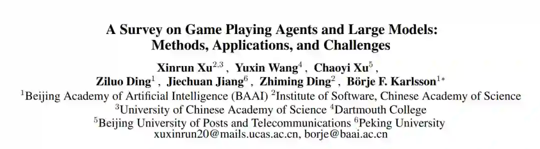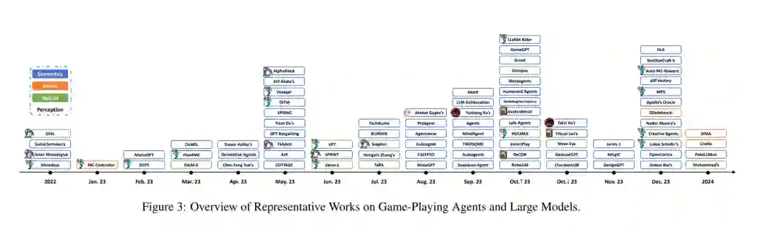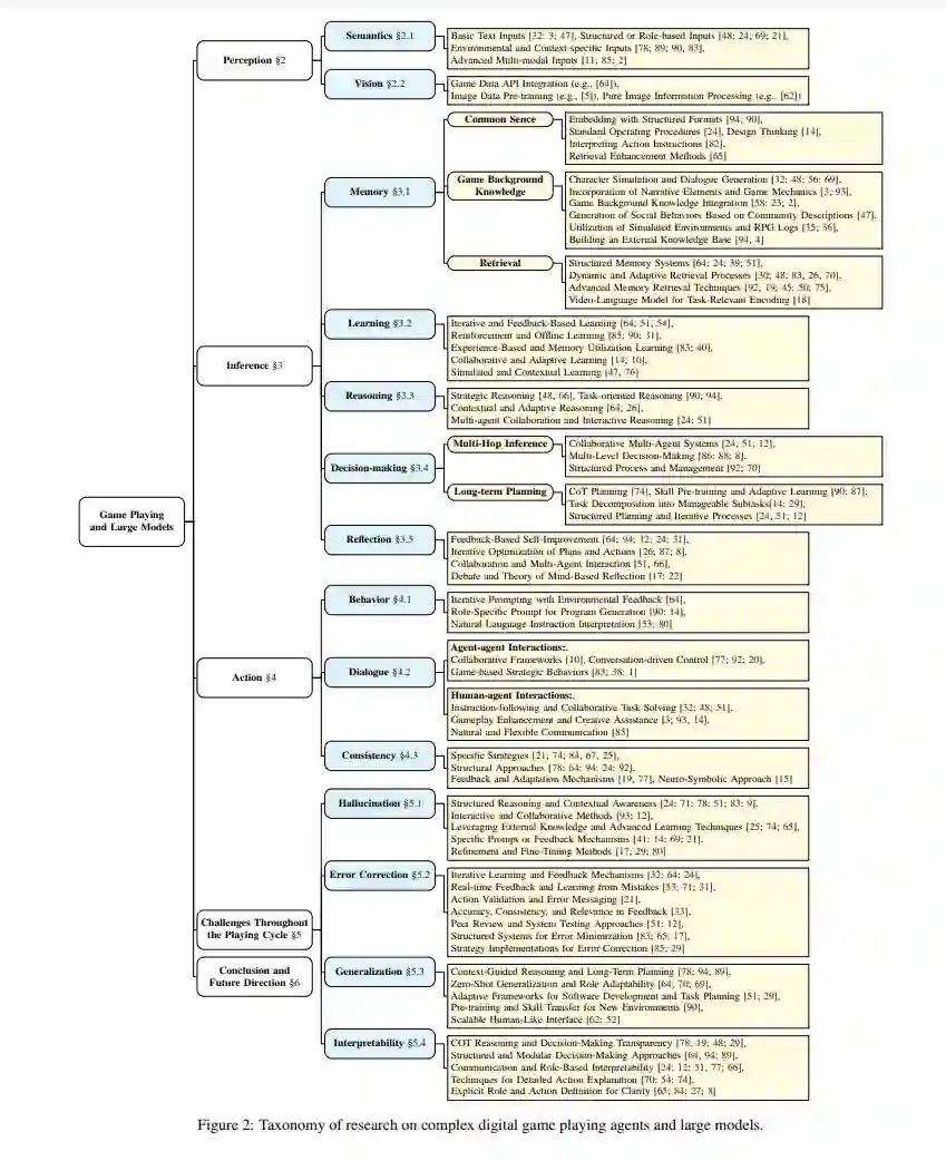 大规模模型(LMs)的发展,包括语言和多模态模型,在自然语言处理和计算机视觉领域是一个重要的进步。最近在LMs方面的进步导致了在各种应用中的显著成就,包括文本生成[93]、图像理解[91]和机器人技术[16]。这些进展促使研究人员探索使用LMs“作为”执行复杂任务的代理,其中许多基于LM的代理(LMAs)在很多情况下展示出与传统训练方法相比有趣的泛化能力[61;70]。LMs所展现的能力导致了人们对其在游戏玩法应用中的浓厚兴趣。这种兴趣在像Minecraft[37]这样的流行游戏中尤为明显,其中LMs处理复杂、动态环境的潜力正在被积极探索。在追求人工通用智能(AGI)研究的背景下,数字游戏因其提供需要高级推理和认知能力的复杂挑战而被认为是重要的,作为评估代理和系统能力的理想基准[79;6]。在游戏环境中的数据获取过程在成本效益、可控性、安全性和多样性方面相比真实世界的实验具有优势,同时保留了重大挑战。尽管即便在学术界之外尝试分析或形式化游戏AI代理及其组件并非最近的现象[42;43;44],但研究LMAs在复杂游戏环境中的表现对于界定它们当前的局限性和评估朝着自主性、泛化能力的进步、指导新架构的设计以及更接近潜在AGI的方向非常关键。此外,这篇综述代表了对游戏玩家代理和大模型的首次全面考察,旨在通过提供对最近将LMAs与游戏玩法应用集成的尝试(例如,作为主玩家、协助人类玩家、控制NPCs)的概览,以及对它们进行情境化和对比,并识别剩余的开放挑战,以催化该领域的后续研究。 人脑功能作为一个复杂的信息处理系统,首先将感官信息转化为感知表征,然后使用这些表征来构建对世界的了解并做出决策,最后通过行动实施决策[13]。由于这一抽象序列反映了在游戏玩法代理中观察到的典型迭代周期,即感知(§2)、推理(§3)和行动(§4),我们在这篇综述中采用了类似的组织结构。图1展示了核心综述结构,覆盖了如何将感官信息转化为行动的本质,以及LMs在每一步骤中可以扮演的角色。感知涉及将游戏过程中的原始观察信息转化为可行的见解,支持后续的交互。最初的研究集中在通过文本理解语义信息[64;83],而更近期的工作集中在整合视觉信息(例如,[91])。推理涵盖了游戏代理的关键能力,包括记忆、学习、推理、反思和决策;通常建立在一个全面的认知框架上。这个框架适应于各种应用背景,这意味着并非每个场景都需要所有个别组件。特别是,记忆是关于有效存储和检索学习知识以增强常识和游戏特定见解的[94;24]。学习通常涉及通过经验和多代理系统中的协作努力获得技能和策略适应[14]。推理是处理和综合信息以解决问题的过程[48]。在复杂游戏中的决策要求多跳推理[34]和长期规划[24],结合序列任务分解和协作决策,以有效应对动态游戏。而反思意味着自我改进的过程,代理基于反馈评估和调整它们的策略[64]。这些组件使得LMs赋能的代理能够在现代数字游戏的动态和演化环境中有效行动。行动涵盖了与游戏环境的互动回馈,即代理响应游戏状态和环境反馈执行的操作。使用生成式编码执行行为,采用技术如迭代提示[64]、角色特定工程[14]或代码生成[64;62]。对话互动涵盖代理-代理和人-代理通信,采用协作框架[12],和对动态互动的对话驱动控制[77]。通过例如使用有向无环图(DAG)的结构方法来强调代理的行为一致性,用于逻辑行动进程[78],结合反馈机制以适应环境[94],并通过策略如强化学习(RL)来加强一致的行动选择[84]。这些方法使LMAs不仅能够处理复杂任务,还能适应行为以保持与游戏目标在动态游戏环境中的一致性和对齐。 尽管如此,在所有阶段(以及在其他游戏场景中)仍然存在挑战。在LMAs中尤其重要的四个挑战包括:i)解决在批判代理和结构化推理中的幻觉问题[24;78];ii)通过迭代学习或反馈(例如,[32])纠正错误;iii)将学习到的知识泛化到未见任务,可能使用零射学习或结构化适应性[64;90];以及iv)可解释性,这要求透明的决策过程。虽然这些在多样化的AI系统中得到展示,它们也突显了LMs针对游戏环境的特定需求的内在限制的影响。 这篇综述的结构概览如图2所示。在§2、§3和§4中,我们回顾现有基于LM的游戏代理如何处理感知、推理和行为。在§5中,我们分析在这三个阶段中遇到的共同挑战。最后,在§6中,我们讨论进一步发展通用游戏玩法代理的未来开放研究方向。