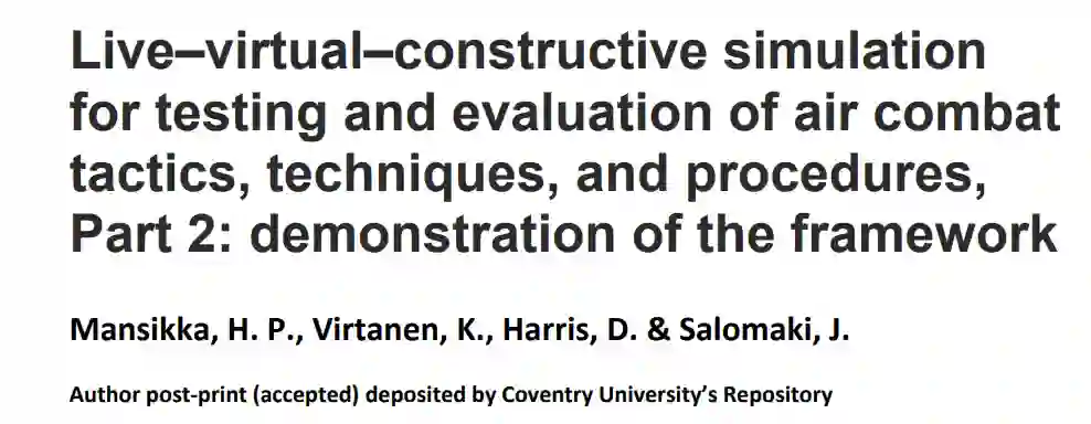本文展示了本研究第一部分讨论的 L-V-C 模拟框架的实施。在空战 TTP 的测试与评估 (T&E) 中演示了该框架的实施。TTP 由描述飞机飞行员如何协调行动以实现空战目标的规则组成。在演示中,TTP 规则分别在 C、V 和 L 模拟阶段反复制定。在 C 阶段,在不考虑人机交互(HMI)中人类行为影响的情况下,确定与飞机存活概率(Ps)和击落概率(Pk)相关的最优规则。在 V 阶段,通过评估 Pk 和 Ps 的适用性,以及有关飞行员态势感知、心理工作量和 TTP 规则遵守情况的人机交互措施,对最佳规则进行修改。在 L 阶段,使用 F/A-18 飞机和合格的战斗机飞行员来评估在 C 和 L 阶段开发的 TTP 是否能在真实环境中实现可接受的 Pk、Ps 和 HMI 测量。