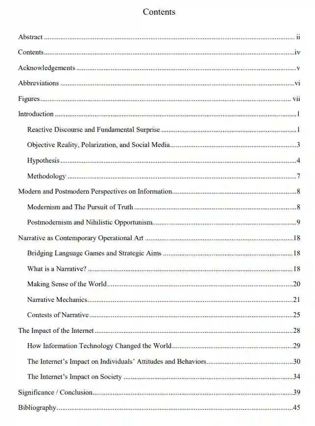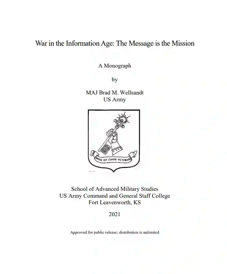信息技术的进步和后现代主义哲学在混乱中茁壮成长,创造了这样的条件:到目前为止,叙述的竞争是实现政治和军事目标的主要方法。在未来的冲突中,更多具有行动和战略意义的行动将发生在 "信息环境 "中,而不是其他地方。物理领域的事件将变得越来越具有战术性,而以叙事形式描述这些事件将成为作战艺术的主导形式。目前的多域作战(MDO)和大规模作战(LSCO)的概念过度强调了未来战争内在的战术方面,而没有涉及暂时占主导地位的作战艺术形式,这种形式通过叙事的力量利用信息技术和后现代主义。美国军方必须认识到互联网和社交媒体所带来的社会变革的意义,以及它对战争性质的影响。正如启蒙运动带来了 "大规模征兵",工业革命带来了 "工业战争 "一样,这场新的 "信息革命 "正在改变战争的特征,并将信息战置于最重要地位。在当代战争中,信息不仅仅是一种能力,它是战略和作战艺术的本质。因此,指挥官和规划者必须将 "信息 "本身视为任务,而不仅仅是战术和作战层面任务的推动者。