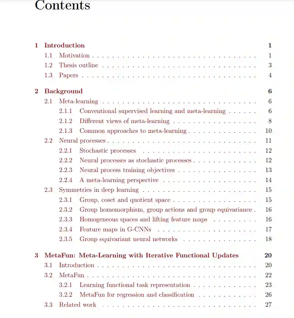 近年来,深度学习的进展在很大程度上得益于数据和计算资源的增加。尽管数据的丰富性使模型在某些领域表现良好,但在实际应用中(例如医学领域),数据往往稀缺或难以收集。此外,也存在将大型数据集视为许多相关的小数据集的情境,其中一个小数据集相关任务的数据可能不充足。同时,人类智能通常只需少量样本即可在新任务上表现出色,这强调了设计数据高效AI系统的重要性。本论文探讨了应对这一挑战的两种策略:元学习和对称性。