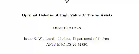 本论文共六章。第一章介绍了解决最优高价值航空资产(HVAA)防御问题的动机,包括研究问题、任务、范围和方法。第二章是多智能体差分博弈的文献综述,重点介绍了与 HVAA 防御相关的工作。第二章还有一节描述了研究空白以及本研究如何解决文献中的空白。第三章介绍了拟议研究中使用的方法和技术,随后介绍了每个研究任务的解决方法。第四章介绍了使用动能武器防御 HVAA 的最佳策略。最后,第六章将总结发言、所做贡献和确定的未来工作。