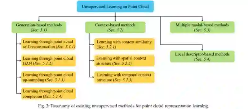 点云数据在各种不利条件下具有较高的准确性和鲁棒性,因此得到了广泛的研究。与此同时,深度神经网络(DNN)在监控、自动驾驶等应用领域取得了令人瞩目的成功。点云和DNN的融合产生了许多深度点云模型,这些模型主要是在大规模和密集标记的点云数据的监督下训练的。无监督点云表示学习旨在从无标记点云数据中学习一般和有用的点云表示,由于大规模点云标记的约束,近年来受到越来越多的关注。本文对使用DNN的无监督点云表示学习进行了全面的综述。首先介绍了近年来研究的动机、常用途径和术语。相关背景包括广泛采用的点云数据集和DNN架构,然后简要介绍。接下来是根据其技术方法对现有的无监督点云表示学习方法的广泛讨论。我们也定量的基准和讨论的方法,在多个广泛采用的点云数据集。最后,我们对未来无监督点云表示学习研究中可能面临的几个挑战和问题提出了自己的看法。