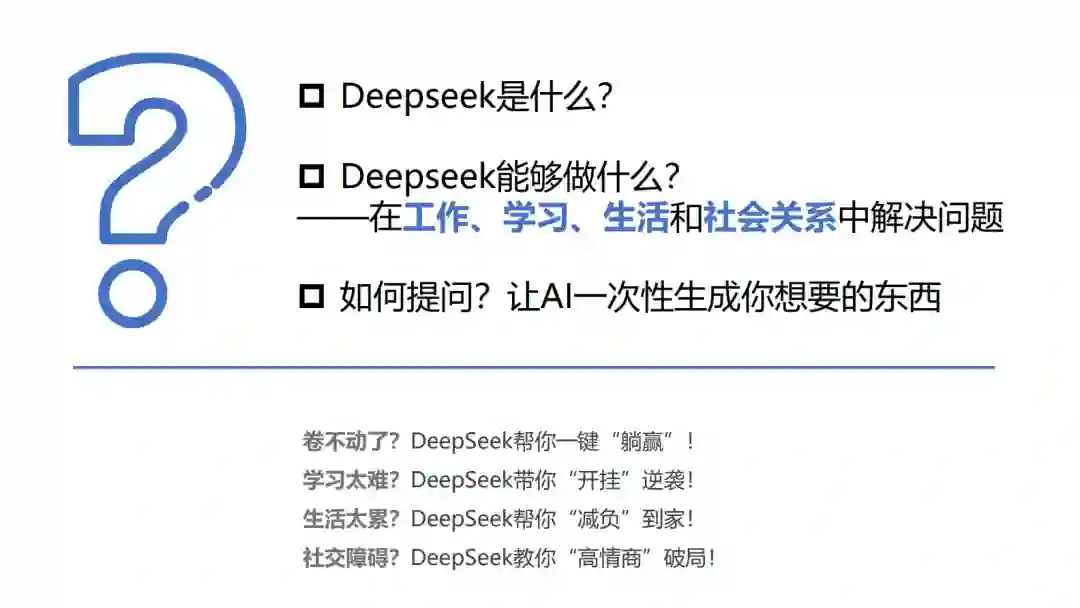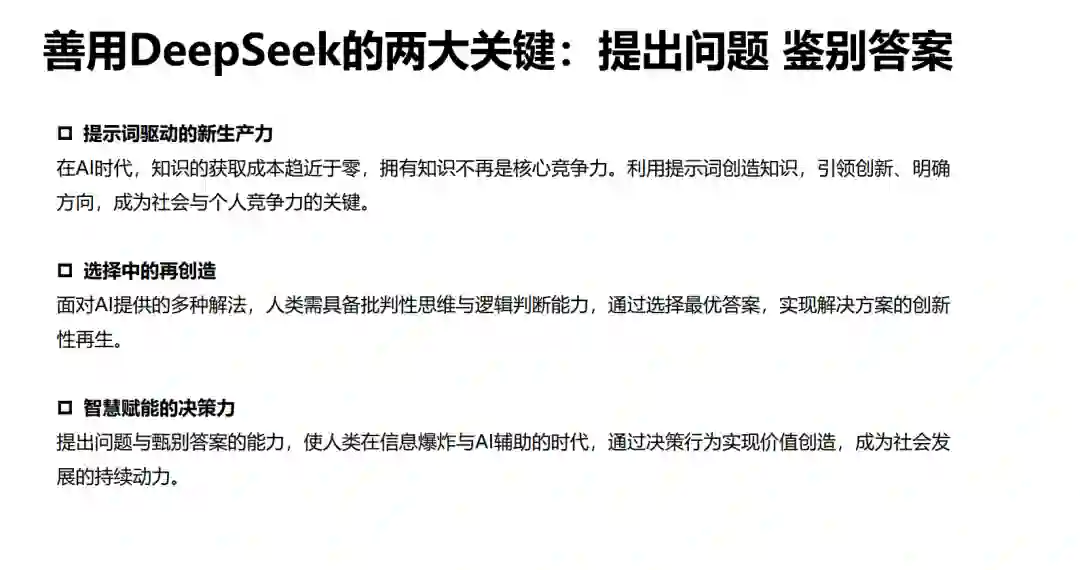 善用DeepSeek的两大关键:提出问题鉴别答案 提示词驱动的新生产力 在AI时代,知识的获取成本趋近于零,拥有知识不再是核心竞争力。利用提示词创造知识,引领创新、明确方向,成为社会与个人竞争力的关键。 选择中的再创造 面对AI提供的多种解法,人类需具备批判性思维与逻辑判断能力,通过选择最优答案,实现解决方案的创新性再生。 智慧赋能的决策力 提出问题与甄别答案的能力,使人类在信息爆炸与AI辅助的时代,通过决策行为实现价值创造,成为社会发展的持续动力。