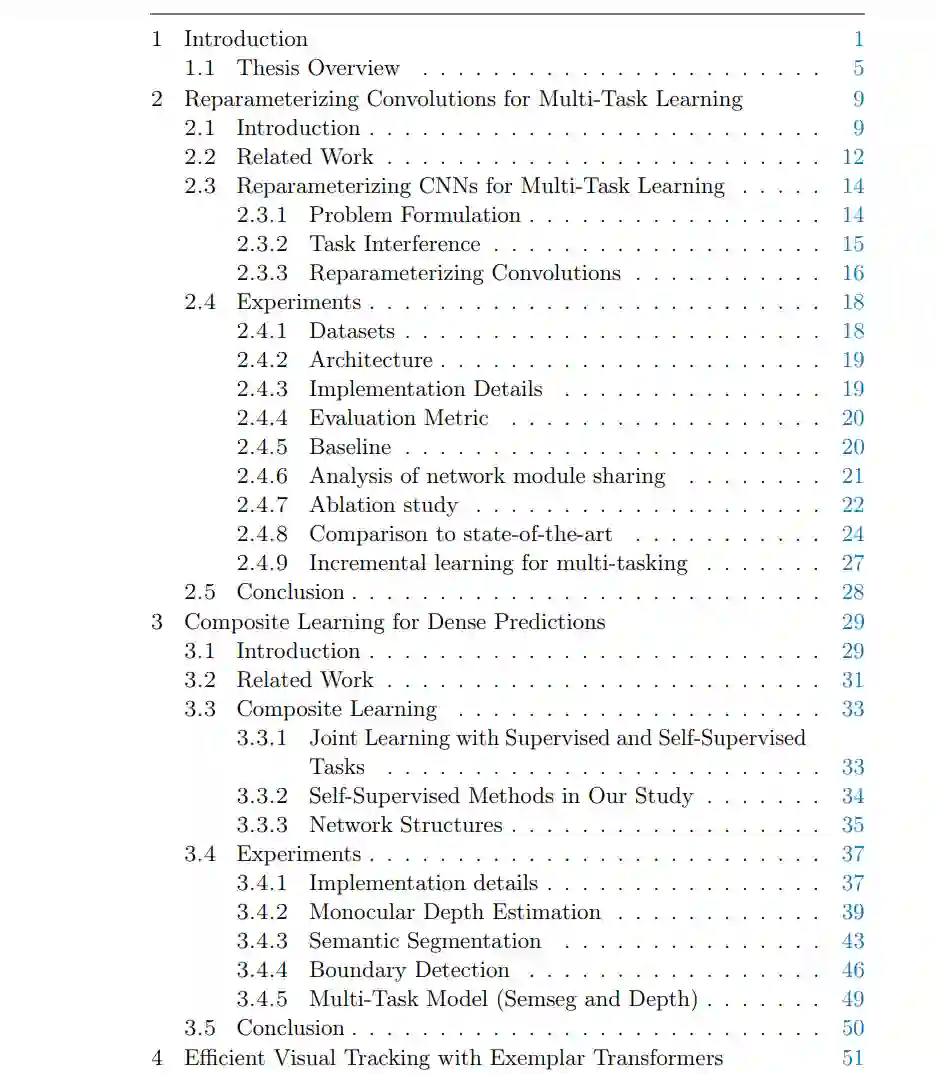 随着时间的推移,更复杂、更强大的深度神经网络的设计不断推动各种任务的最新水平。在追求增加性能的过程中,计算复杂性常常受到严重阻碍,这体现在参数数量的显著增加、需要的浮点运算以及延迟。尽管深度神经网络的巨大进步增加了人们在下游应用(如机器人技术和增强现实)中使用它们的兴趣,但这些应用需要计算效率高的替代方案。这篇论文关注的是设计高效的深度神经网络,具体来说,是在给定的计算约束下提高性能,或者在性能下降不大的情况下降低复杂性。首先,我们介绍了一种新颖的卷积操作重参数化及其在多任务学习中的应用。通过重参数化卷积操作,我们可以以总参数数量的一部分实现与单任务模型相当的性能。其次,我们进行了广泛的研究,评估自我监督任务作为多任务学习框架中的辅助任务的效果。我们发现,与自我监督任务一起训练目标任务可以提高性能和鲁棒性,常常优于有标签的辅助任务,而且不需要修改部署时使用的架构。