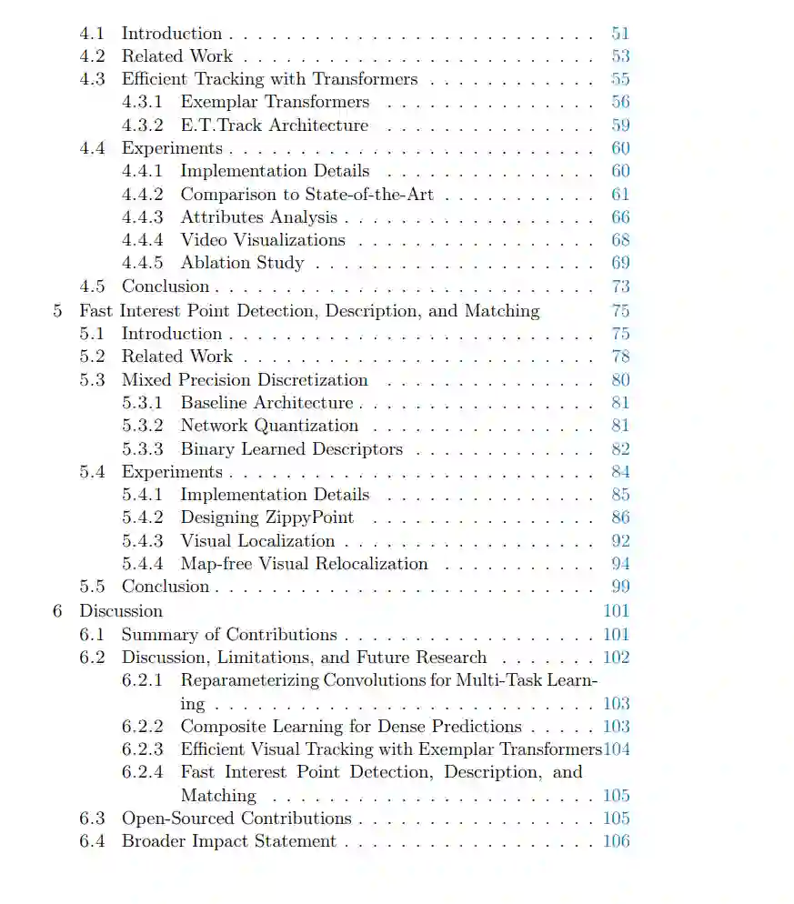 第三,我们提出了一种新颖的用于高效单物体视觉跟踪的变换器层。我们证明了实时单物体追踪器的性能可以在不影响延迟的情况下显著提高,同时始终优于其他变换器层。最后,我们研究了适应利用点检测和描述神经网络用于计算能力有限的平台的有效性。我们发现,网络组件的混合精度量化,结合二元描述符归一化层,可以在性能稍有下降的同时,至少提高一个数量级的稀疏3D地图的大小、匹配速度和推理速度。总结来说,这篇论文关注的是在计算限制下设计深度神经网络。随着对高效深度网络的兴趣和需求的增加,我们预见所提出的工作将为更高效的方法铺平道路,弥合与性能更好的替代方案之间的差距。
