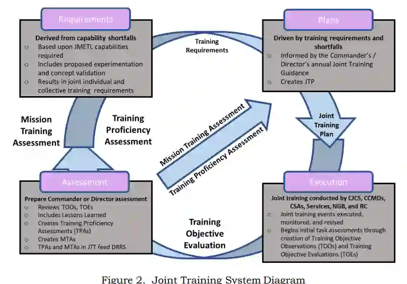 背景。作战指挥官负责确保所属部队的战备状态,并对其指挥范围内的军事行动、联合训练与后勤保障实施全面指导。联合训练系统是以使命任务为核心、基于联合使命基本任务清单的方法体系,用于规划、执行与评估联合训练。a. 联合训练是指运用联合条令或战术、技术与程序,对个人、单位及参谋机构进行训练(包括任务预演),使联合部队或联合参谋机构具备应对作战指挥官认定执行指定或预期任务所必需的战略、作战或战术需求的能力。此类训练可涵盖跨组织伙伴参与,包括美国政府其他部门与机构;州、地方及部落政府;外国军队与政府机构;国际组织;非政府组织以及私营部门。b. 国防部将运用联合训练系统支持总统国家演习计划。该计划包含以操演为基础的演习,涉及各部门与机构主要负责人,并由总统参与。这些演习致力于实现美国政府战略与政策层级目标,并对国家响应体系提出挑战。国防部通过认证演习计划参与国家演习计划。c. 认证演习计划旨在通过定期举行战略级国家级演习,检验多种模拟危机情境下的计划、政策与程序,提升美军实施联合行动的战备能力。d. 联合演习计划是作战指挥官保持部队训练有素与战备状态、演练应急预案并支持战役计划交战活动的主要手段。作战指挥官指定联合演习计划项目,用以训练其司令部联合使命基本任务清单所述的使命需求,并支持指挥计划中规定的战区与全球安全合作需求。作战指挥官指定的联合演习计划项目可包括作战司令部、军种组成部队、联合及多国训练项目。经联合国家级训练中心认证的军种及美国特种作战司令部训练项目可纳入联合演习计划。e. 军种联合国家级训练中心训练项目将联合要素融入战术与作战层级的项目演习,使部队具备满足作战指挥官使命需求的能力。联合国家级训练中心为经其认证的军种训练项目提供联合要素资源保障。f. 联合训练环境通过对作战环境进行必要且充分的复现,为用户实施联合训练与联合部队发展提供支持。该环境由影响战备水平达成与能力运用的条件、环境及各种因素所定义,这些要素均基于指挥官的决策。联合训练环境为认证演习计划与联合演习计划提供支撑。g. 作战指挥官必须同步协调司令部的联合训练计划、安全合作规划、军种组成部队训练计划以及其他作战司令部、作战支援机构与支援性联合组织的外部支持。为确保无缝的操作环境,司令部联合训练计划还应考虑与其他美国政府机构、伙伴、非政府组织及政府间组织的跨机构需求。
