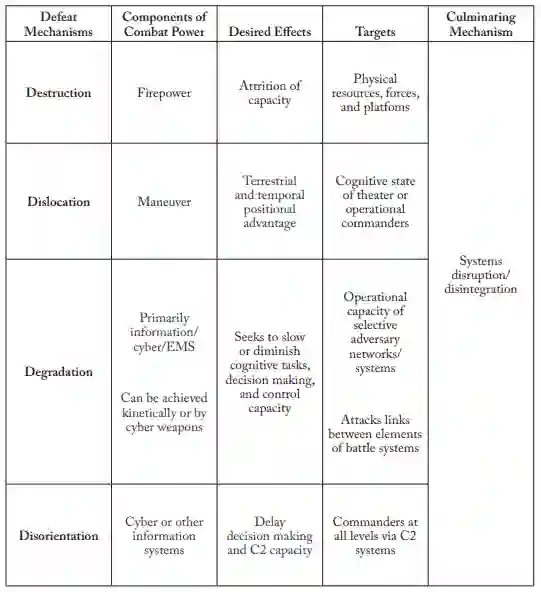 表1的第一栏反映了文章开头介绍的制胜机理。随后的几栏总结了与每个制胜机理相关的战斗力的主要组成部分,期望的效果,以及与之相关的具体目标。最后一栏记录了被认为是最终的机理--系统破坏或瓦解,是熟练的作战艺术和时间与空间效果协调的产物。