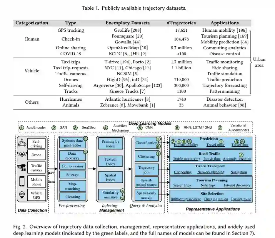传感器和移动设备的最新进展使城市轨道数据的可用性和收集量空前增加,从而增加了对更有效地管理和分析正在产生的数据的方法的需求。在本次综述中,我们全面回顾了轨迹数据管理的最新研究趋势,包括轨迹预处理、轨迹存储、常用的轨迹分析工具,如查询空间和空间文本的轨迹数据,以及轨迹聚类。我们还探讨了四种密切相关的分析任务,它们通常用于交互式或实时处理的轨迹数据。并首次回顾了深度轨迹学习。最后,我们概述了轨道管理系统应具备的基本质量,以最大限度地提高灵活性。