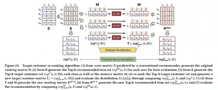 预测产品的潜在目标客户至关重要。 但是传统的推荐系统通常旨在优化参与度指标,而不考虑目标客户的总体分布,从而导致严重的失真问题。 在本文中,我们进行了一项数据驱动的研究,以揭示传统推荐者引起的几种失真。 为了克服这些问题,我们提出了一种目标客户重新排序算法,以在维持推荐质量的同时调整某项前k位目标客户的总体分布和构成。 通过将该提议的算法应用于现实世界的数据集,我们发现该提议的方法可以有效地使商品的目标客户的类别分布接近所需的分布,从而减轻失真。