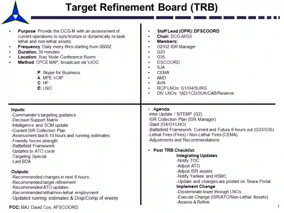 值得注意的是,TRB 并没有取代慎重的目标定位过程。目标定位工作组(TWG)和目标定位决策委员会(TDB)仍是指挥官批准优先目标的主要机制。相应地,TRB 也是 CUOP 的目标调整工具。已规划和安排的资源被调整为打击对手而非计划。