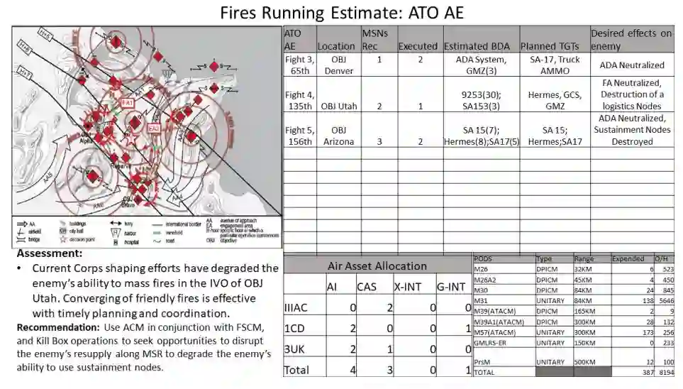 每个 TRB 首先更新 G35 战场框架,然后更新 G2 敌情模板(SITEMP)和 ISR 态势。然后,DFSCOORD 提供最新的火力运行评估(FRE),分享军团执行先前计划的联合火力和效果的观点。这种实时评估使所有参与者了解了当前战斗的必要情况,为在 ATO 内更改计划提供了决策依据。
