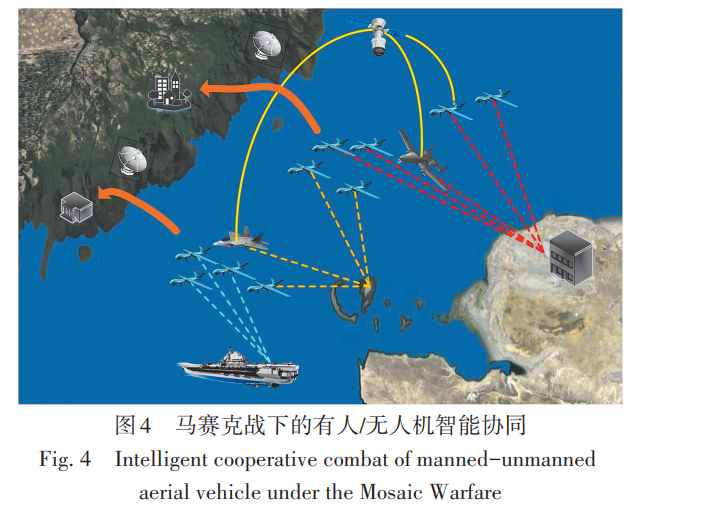 摘 要 为提高空战效能,以马赛克战为指导,研究复杂战场环境下的有人/无人机智能协同作战模式。介绍了有人/无人机协 同作战的研究现状以及传统有人/无人机协同作战的编队特点。在此基础之上,引入马赛克战思想,设计了基于马赛克战的有 人/无人机智能协同作战模型,对所提智能协同作战模型进行了可行性分析并描述了协同细节;分别从灵活性、决策能力、战争 成本、杀伤效力和安全性等方面分析其作战优势;从 6个方面总结了智能协同作战模式所需关键技术。 关键词 协同作战,马赛克战,无人机,人工智能,杀伤链!