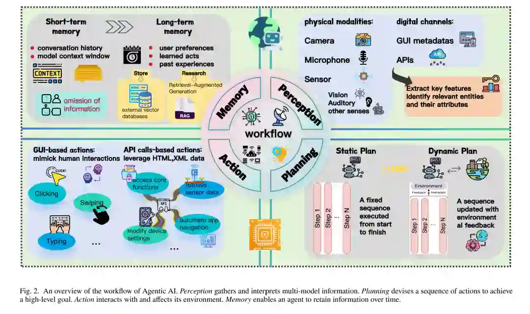 智能体式 AI 指能够在最少人工监督下,通过感知、推理、规划和行动来实现目标的自主系统 [8]。这些系统在一个连续循环中运行,通常称为 智能体循环(agentic loop),由四个核心模块组成:感知(Perception)、规划(Planning)、行动(Action)和记忆(Memory) [8]。