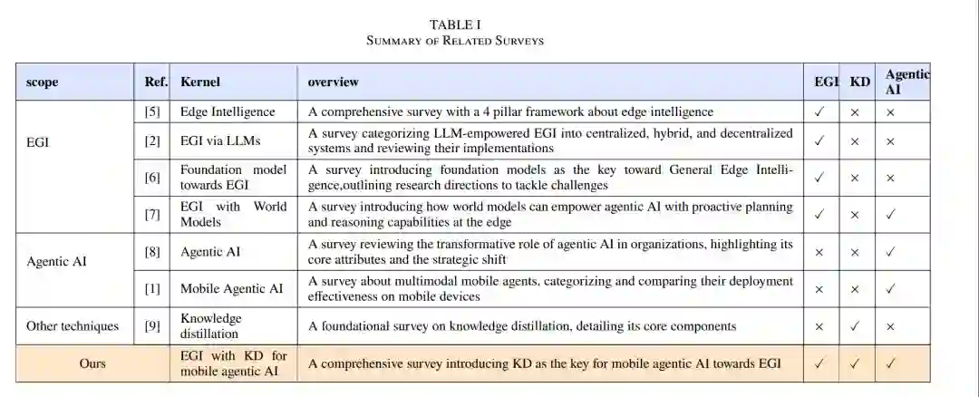 利用 KD 推进智能体 AI 并实现其在 EGI 中的部署,已展现出巨大潜力,可显著降低计算开销并增强其在动态无线环境中的适应性。本文旨在提供关于 KD 基础、其在智能体 AI 中的应用,以及支撑 EGI 部署的新型技术的全面综述。表 I 展示了相关综述的深入比较,重点强调 KD、智能体 AI,以及它们在 EGI 中的实现方式。