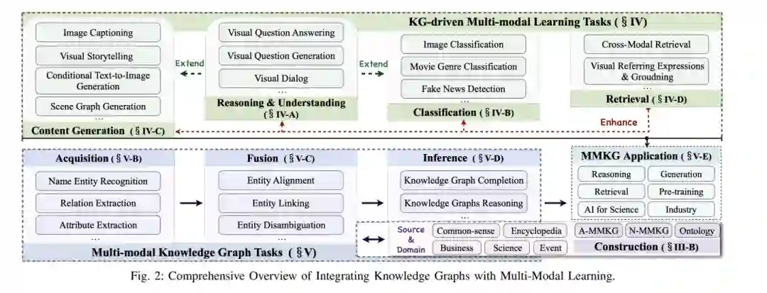 本节探讨了KGs在增强多模态学习任务中的作用。作为关键的符号知识载体,KGs在启用一系列需要丰富背景知识的任务中发挥着至关重要的作用,包括但不限于生成、推理、理解、分类、检索和预训练。通过在统一框架内提出系统的分类法,我们旨在明晰各种方法的本质,从而丰富对该领域的理解并指导未来的研究方向。