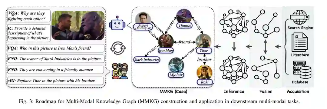 本节转向关注多模态知识图谱(MMKG)研究内的最新趋势和讨论。如图3所示,MMKG的构建过程反映了人类的认知操作,包括信息的获取、融合和推理。在这一发展过程中,已经识别出了各种任务(即In-MMKG任务),将MMKG定位为解决一系列下游多模态任务的基石。