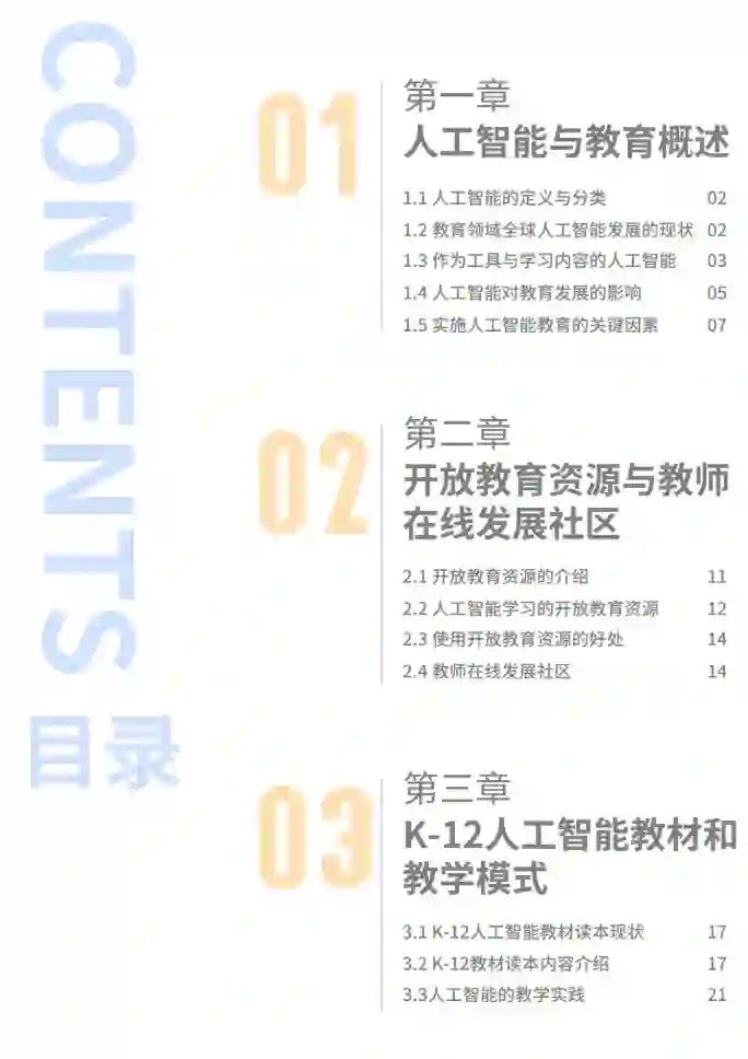 第一章为概述,在明确人工智能的概念和综述教育领域人工智能发展现状的基础上,阐述了人工智能与教育的两种关系∶作为辅助教育工具的人工智能,以及作为学习内容的人工智能。以《北京共识》为基础,总结人工智能对教育发展的影响,并提出人工智能教育支撑环境的五个关键要素。