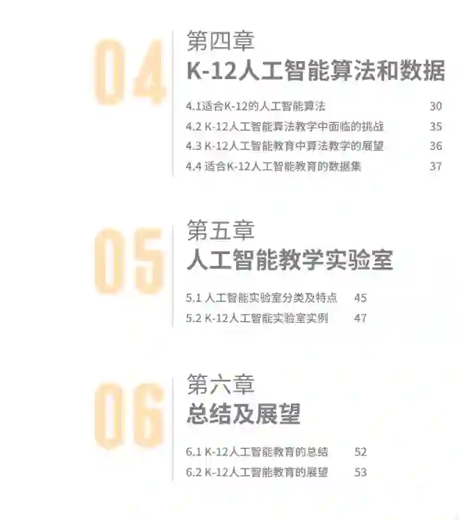 第二至五章分别介绍了全球K-12人工智能支撑环境中各要素情况。其中,第二章介绍了开放教育资源与教师在线发展社区,分析了使用开放教育资源的好处,举例介绍了部分人工智能学习平台以及教师在线发展社区。第三章对K-12人工智能教材读本的现状进行总结,介绍了不同年龄段的人工智能教材读本的内容选择,并介绍了部分人工智能教学实践。第四章介绍了K-12人工智能算法及算法教学中面临的挑战与展望,对算法教学中可能涉及到的数据集进行了梳理与总结。第五章介绍了人工智能教学实验室的分类及特点,并列举了部分教学实验室案例。