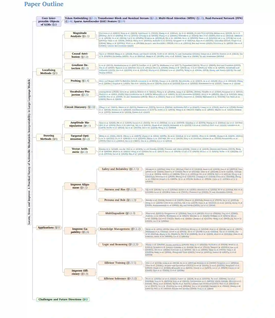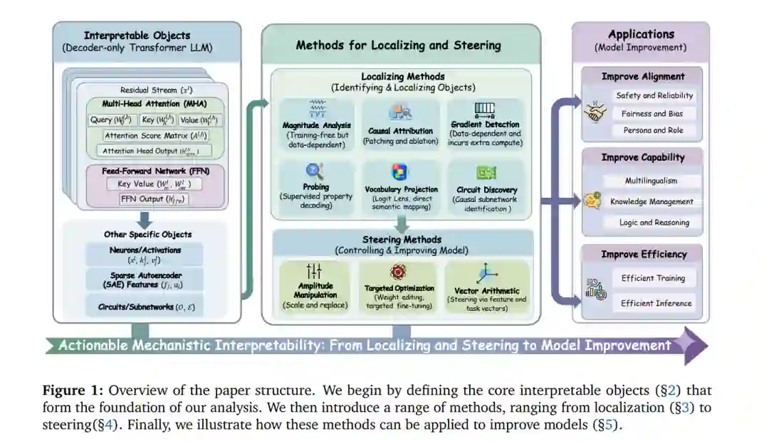 大语言模型(LLMs)近期取得了卓越的成功,在从复杂推理、多语言处理到高度专业化领域的广泛应用中展现了出色的性能 (Li et al., 2025i; Ren et al., 2025b; ...; Qwen et al., 2025)。尽管取得了这些进展,一个关键挑战依然存在:这些模型的内部决策过程在很大程度上是不透明的,通常作为“黑盒”运行。这种透明度的缺失带来了显著风险,特别是在安全关键型应用中,并严重限制了我们高效调试、控制和优化模型行为的能力 (Huang et al., 2024a; Hong et al., 2024; Zhang et al., 2025d)。因此,机械解释性(Mechanistic Interpretability, MI)已成为一个关键的研究方向。与传统的行为分析不同,MI 旨在对这些复杂的神经网络进行“逆向工程”,将其复杂的计算分解为可理解的组件和因果机制 (Ferrando et al., 2024; Zhao et al., 2024a; Geiger et al., 2025)。 目前该领域的研究大致分为两类。大量工作聚焦于 MI 的理论与基础层面 (Räuker et al., 2023; ...; Gantla, 2025)。这些研究为剖析 Transformer 架构和识别基础单元提供了技术路线图。然而,它们主要优先考虑科学发现——旨在为了理解模型自身而阐明其内部运作机制。它们通常将 MI 视为一门观测性科学,而对于如何将这些微观见解转化为实际的模型改进,研究尚不充分。 认识到解释性的应用潜力,第二条研究路线已开始弥合理论理解与实际利用之间的鸿沟。这些综述讨论了如何利用 MI 技术辅助下游任务或特定领域 (Luo and Specia, 2024; ...; Lin et al., 2025)。然而,尽管这些综述做出了贡献,但仍面临两个主要局限,阻碍了其更广泛的采用。首先,它们往往缺乏在实际应用语境下对 MI 方法的充分分类和清晰定义,诊断工具与干预技术之间的区别经常模糊不清。其次,它们对应用的覆盖往往不够全面,且对方法的说明通常过于笼统。这种高层级的抽象使得研究人员难以将理论上的机械见解转化为针对特定问题的可操作干预。因此,目前明显缺乏一个能够系统分类这些方法并清晰展示“主动模型改进”具体流程的统一指南。 为了填补这一空白,我们提出了“定位、引导与改进(Locate, Steer, and Improve)”流水线。这一概念框架旨在系统地将 MI 从一门被动的观测性科学转变为一门可操作的干预学科。本工作的主要贡献如下: * 1) 严谨的流程驱动框架: 我们建立了一个将 MI 应用于现实世界模型优化的结构化框架。我们首先定义了 LLMs 中的核心可解释对象(如神经元、注意力头、残差流)。基于应用工作流,我们将方法论清晰地划分为两个不同阶段:定位(诊断)——识别负责特定行为的因果组件;以及引导(干预)——主动操纵这些组件以改变模型输出。至关重要的是,针对每种技术,我们都提供了详细的方法论形式化描述及其适用对象和范围,帮助读者快速理解技术实现及适用的使用场景。 * 2) 全面的应用范式: 我们围绕三个主题对 MI 应用进行了广泛调研:提升对齐性、提升能力和提升效率。这些主题涵盖了从安全性和多语言处理到高效训练等八个具体场景。我们并没有简单地列举相关论文,而是总结了每个场景下具有代表性的 MI 应用范式。这种方法使读者能够快速掌握 MI 技术在不同应用语境下的独特使用模式,促进方法向新问题的迁移。 * 3) 见解、资源与未来方向: 我们批判性地讨论了当前可操作 MI 研究中的挑战,并勾勒了具有前景的未来方向。为了促进进一步的进展并降低准入门槛,我们精心策划了包含 200 多篇论文的完整合集,并在表 2 中列出。这些论文根据其对应的定位和引导方法进行了系统标记,为社区提供了一个实用且易于导航的参考资料。