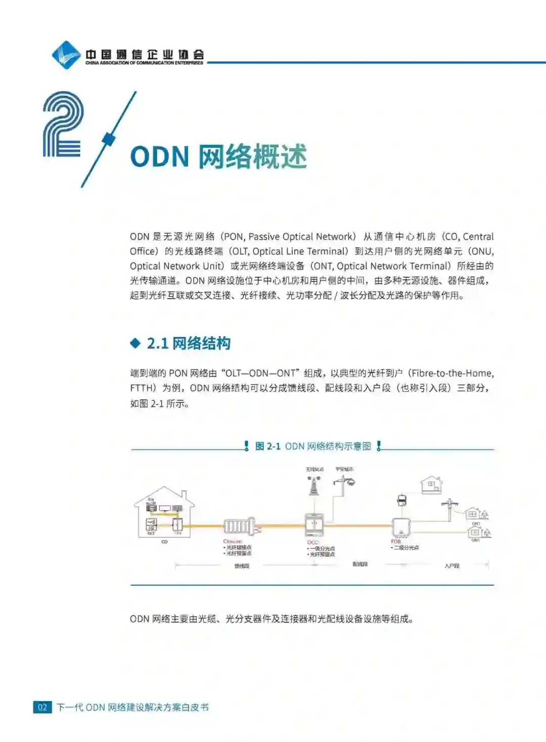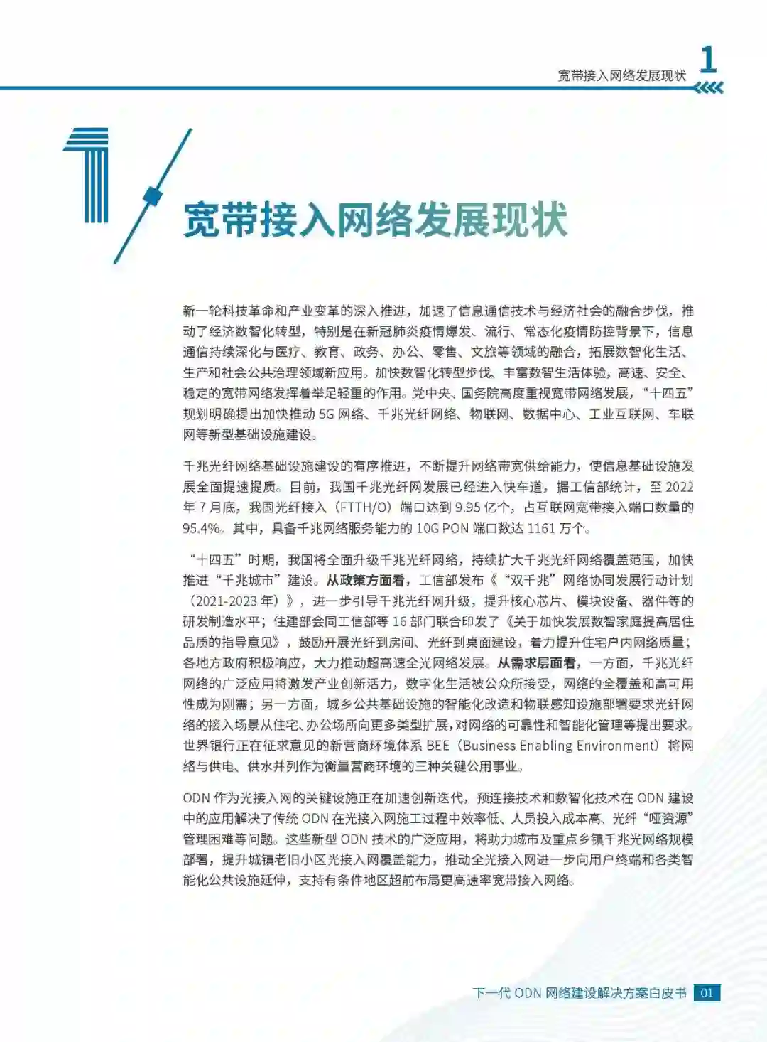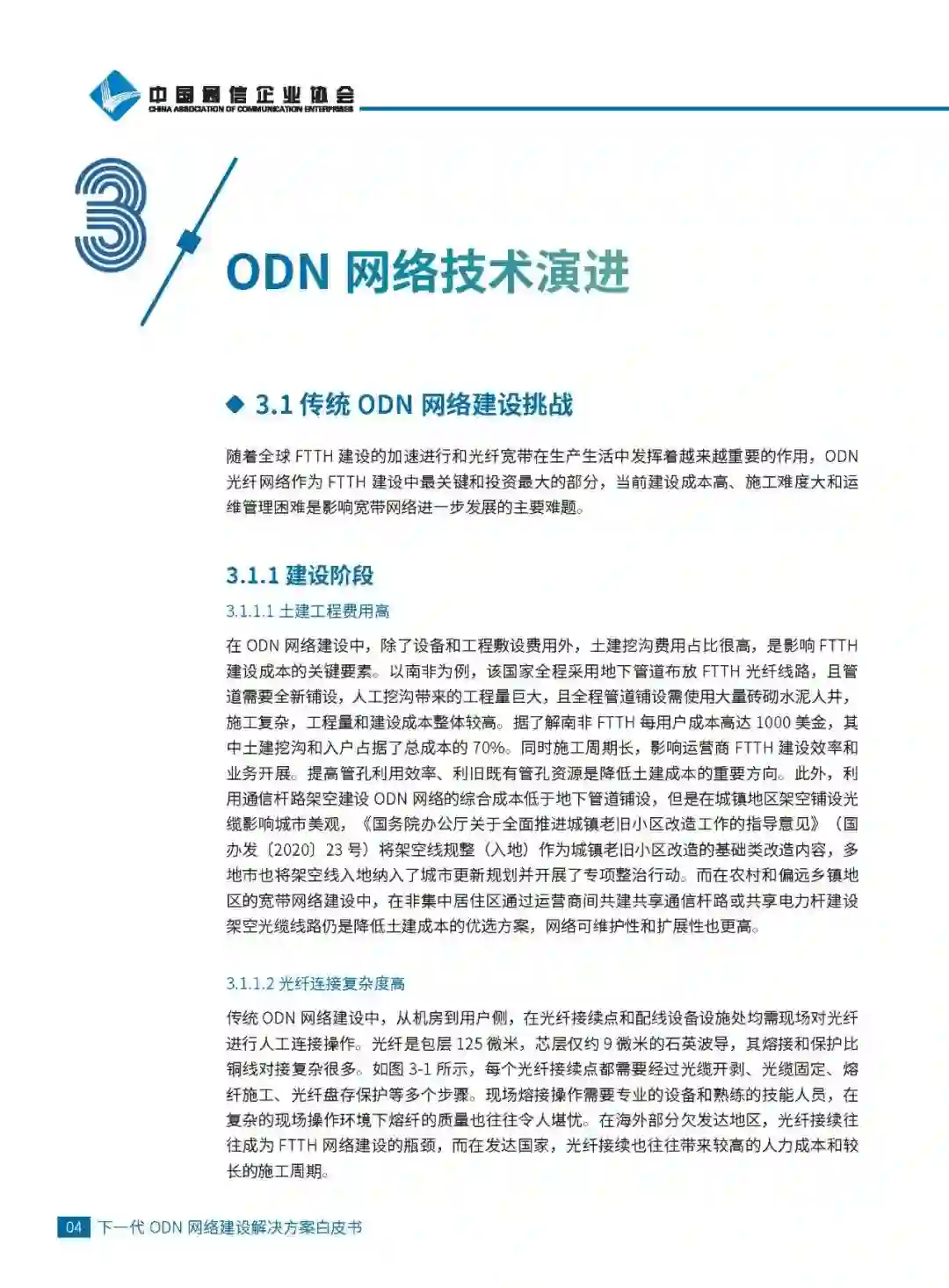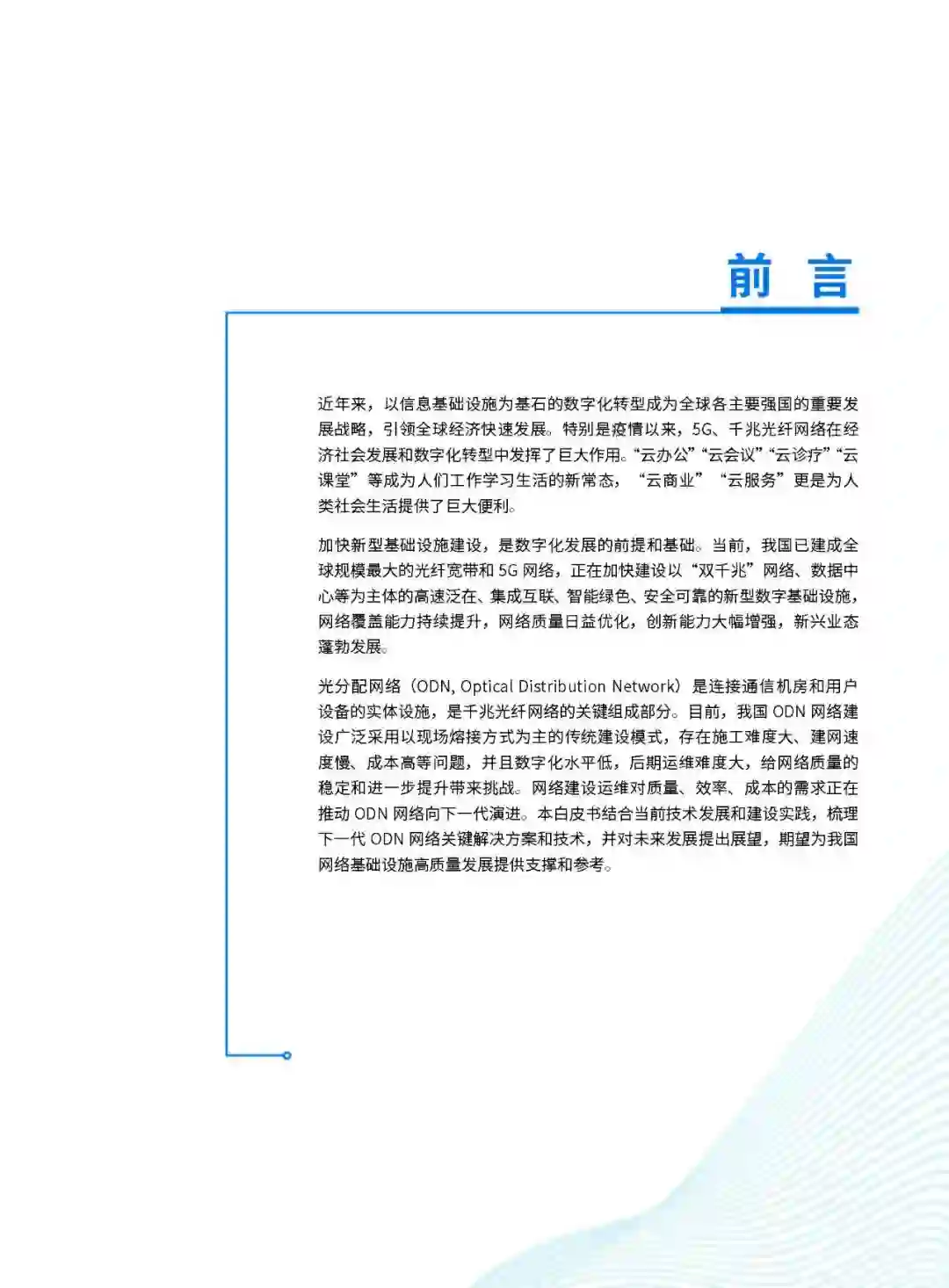 加快新型基础设施建设,是数字化发展的前提和基础。当前,我国已建成全球规模最大的光纤宽带和5G网络,正在加快建设以“双千兆”网络、数据中心等为主体的高速泛在、集成互联、智能绿色、安全可靠的新型数字基础设施,网络覆盖能力持续提升,网络质量日益优化,创新能力大幅增强,新兴业态蓬勃发展。 光分配网络(ODN,Optical Distribution Network)是连接通信机房和用户设备的实体设施,是千兆光纤网络的关键组成部分。目前,我国ODN网络建设广泛采用以现场熔接方式为主的传统建设模式,存在施工难度大、建网速度慢、成本高等问题,并且数字化水平低,后期运维难度大,给网络质量的稳定和进一步提升带来挑战。网络建设运维对质量、效率、成本的需求正在推动ODN网络向下一代演进。本白皮书结合当前技术发展和建设实践,梳理下一代ODN网络关键解决方案和技术,并对未来发展提出展望,期望为我国网络基础设施高质量发展提供支撑和参考。