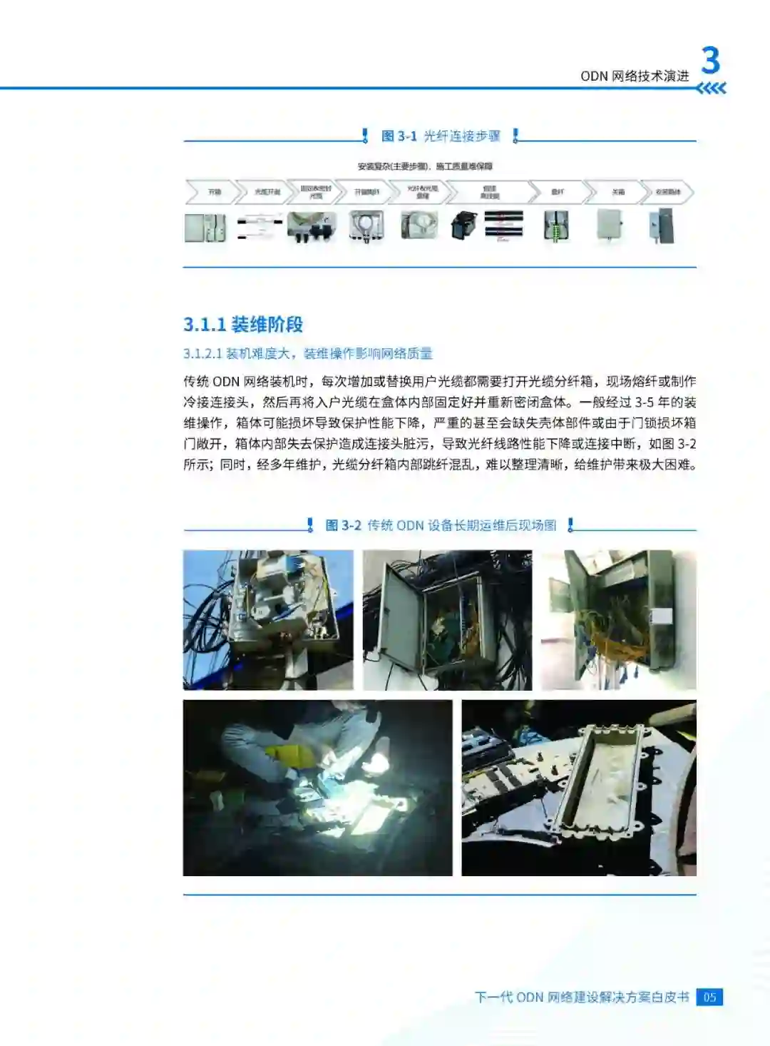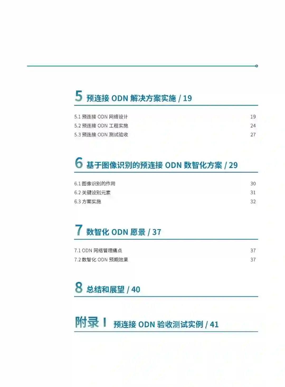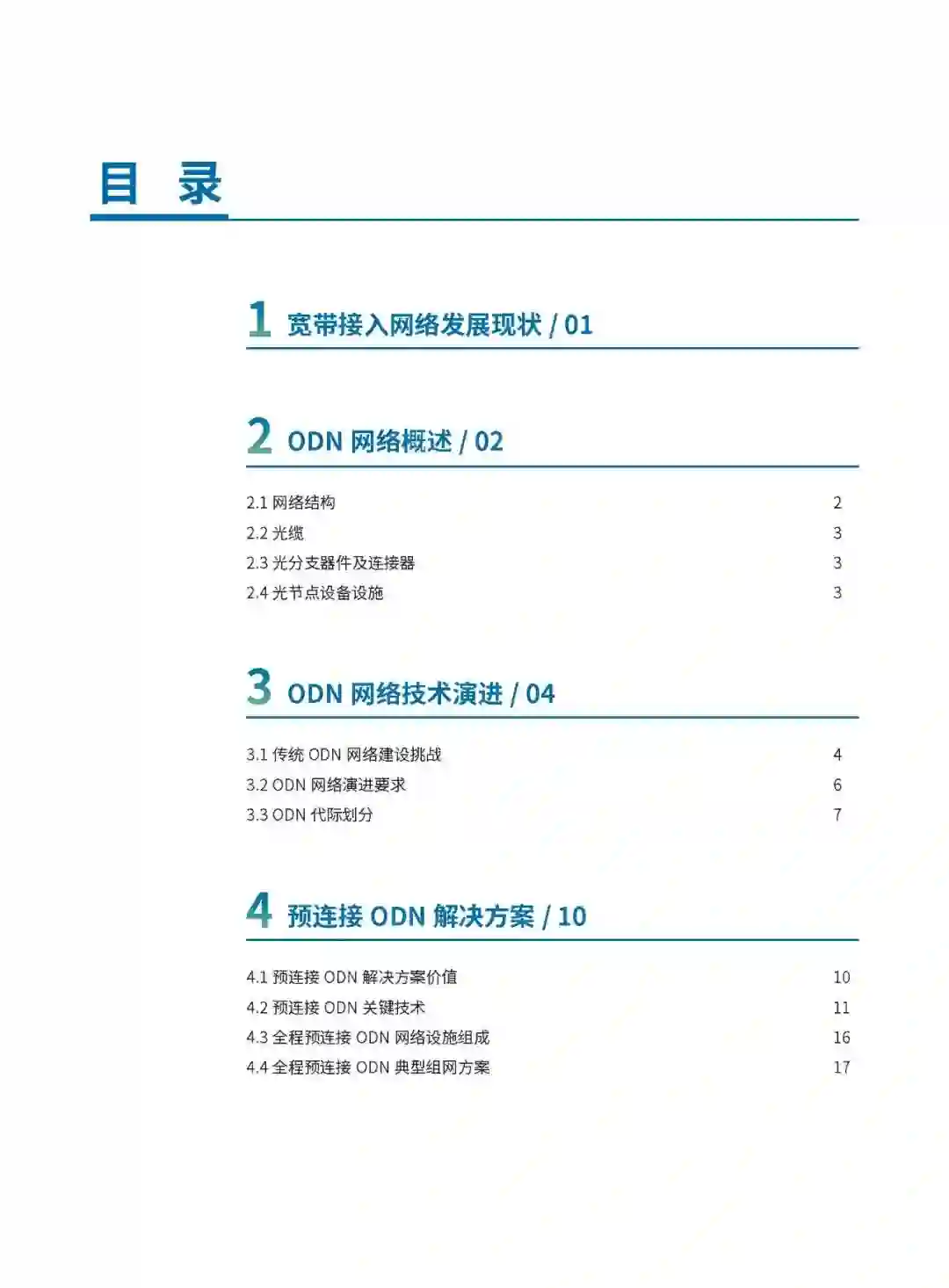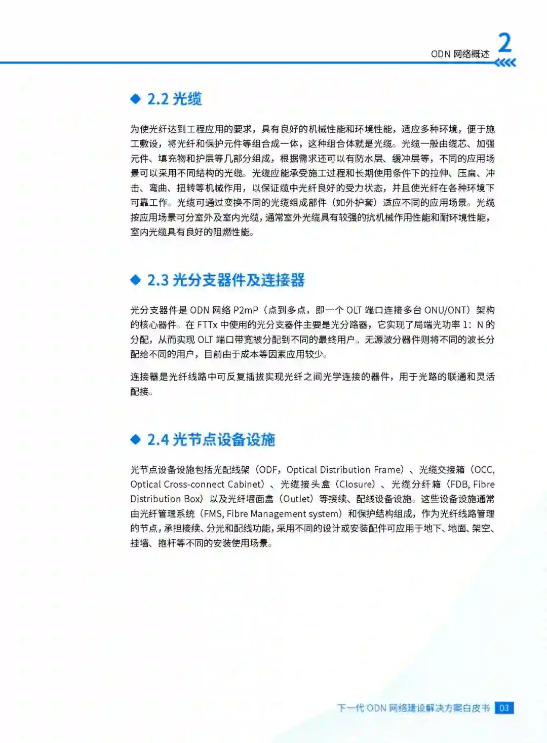 加快新型基础设施建设,是数字化发展的前提和基础。当前,我国已建成全球规模最大的光纤宽带和5G网络,正在加快建设以“双千兆”网络、数据中心等为主体的高速泛在、集成互联、智能绿色、安全可靠的新型数字基础设施,网络覆盖能力持续提升,网络质量日益优化,创新能力大幅增强,新兴业态蓬勃发展。 光分配网络(ODN,Optical Distribution Network)是连接通信机房和用户设备的实体设施,是千兆光纤网络的关键组成部分。目前,我国ODN网络建设广泛采用以现场熔接方式为主的传统建设模式,存在施工难度大、建网速度慢、成本高等问题,并且数字化水平低,后期运维难度大,给网络质量的稳定和进一步提升带来挑战。网络建设运维对质量、效率、成本的需求正在推动ODN网络向下一代演进。本白皮书结合当前技术发展和建设实践,梳理下一代ODN网络关键解决方案和技术,并对未来发展提出展望,期望为我国网络基础设施高质量发展提供支撑和参考。