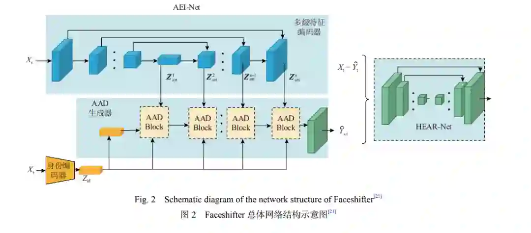 传统的面部替换主要是基于图形学的伪造,通 过 3D 人脸模型的重建以及追踪等技术实现人脸的 替换. 近十年的图形学图片人脸替换方法逐步实现 了全自动,kevin[13] 用 3D 多线性模型追踪原视频和目 标视频的面部表现,使用相应的 3D 图形将源视频匹 配到目标视频中实现自动化人脸替换. 近年来,随着深度学习的迅猛发展,基于深度学 习的换脸技术的时间成本和门槛逐渐降低,以深度 学习为基础的面部替换技术得到了更广泛的应用, 也推动了面部替换方法的研究. 早期的面部替换技 术主要基于自动编码器. Deepfakes[14] 是一种被 reddit 用户使用的深度伪造换脸工具,基于自动编码器,包 含 1 个编码器和 2 个解码器,组成 2 个自动编码网络, 分别用源人物和目标人物的面部图片同时训练,以 实现解码器分别重现人脸的能力. 在换脸过程中交换编码器,实现在目标人物的图片编码中提取出源 人物的人脸. Fast Face-swap[15] 是一种基于 CNN 的风 格转换网络的换脸方法,通过神经网络标注人脸特 征点,实现背景分割和人脸对齐,采用 texture networks[16] 的卷积神经网络结构实现风格迁移任务.除了自动编码器 ,GAN 等生成模型也被应用 到面部替换中,极大提高了生成图片的图像质量. FaceswapGAN[17] 是 Deepfakes 融入 GAN 的产物,引入 了去噪自动编码器和面部交换注意力机制,提高了 图片的真实程度,同时通过生成分割掩码解决图像 的遮盖问题. Natsume 等人[18] 使用 VAE-GAN 网络结 构,引入 3 重损失函数验证身份信息损失,实现了较 为稳定的人脸替换. 之后该团队提出了人脸替换和 人脸面部特征编辑的集成系统 RSGAN[19] ,使用 2 个 自动编码器在隐空间中分别表示头发区域和面部区 域,通过替换面部的隐空间表示来实现换脸并重建 整个人脸图像,能够解决之前换脸方法如 3D 变形人 脸模型的人脸朝向和光照不匹配等问题. FSGAN[20] 通过基于 RNN 的方法将目标人脸的表情和面部动作 重现给源人脸,实现了较好的泛化能力,并覆盖了表 情迁移和身份替换 2 个任务,可以使用较少的样本 进行训练. Li 等人[21] 提出了一种新的 2 阶段的换脸 方法 Faceshifter,其模型结构如图 2,在解码器中自适 应注意力去正化(AAD)、自适应地集成人脸合成的 特征和属性,同时在第 2 阶段引入了启发式的错误 承认细化网络(HEAR-Net),以自监督的方式解决面 部遮挡问题. Simswap[22] 使用身份注入模块解除身份 限制,并在损失函数中引入弱特征匹配损失.随着小样本学习的方法的不断出现,为了解决 训练样本难以获得的问题,MegaFS[23] 通过分层表征人脸编码器提取更多人脸特征,并在不经过特征解 耦的情况下非线性地将身份信息从源图像迁移到目 标图像. 同时由于 MegaFS 可以分模块训练,可以适 用于百万像素级图片的面部伪造. 类似的小样本学 习和单样本学习的应用可以降低深度伪造的应用门 槛,提升相关工具的易用性.