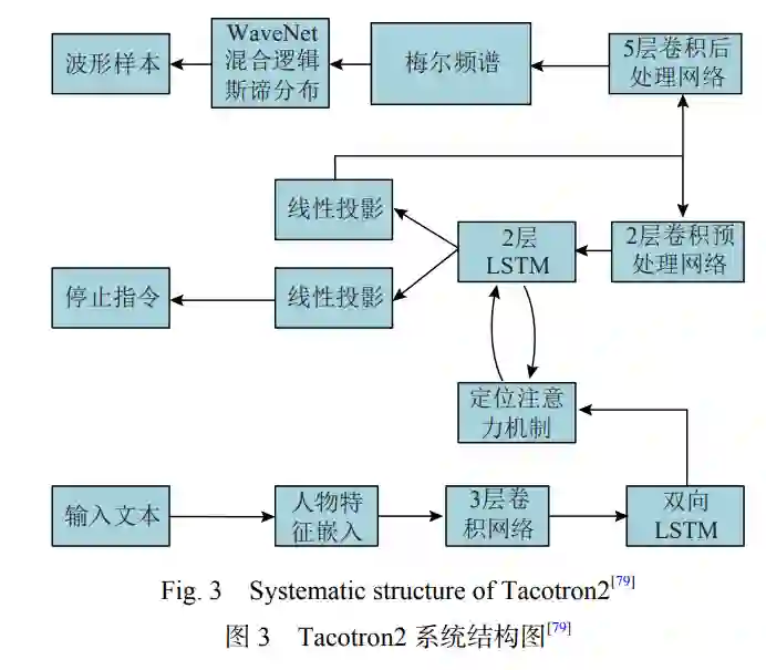 **3.1 语音生成技术 **语音生成技术的实现主要基于 2 种方法:波形拼 接和统计参数. 其中波形拼接方法是早期常用方法, 首先分析文本以及韵律,再进行波形拼接. 虽然其使 用了自然语音波形,可以合成出高自然度的合成语 音,但是对于不同领域的文本合成稳定性不强,在任 意文本的语音合成中表现不佳. 统计参数方法可以 分 为 基 于 隐 马 尔 可 夫 模 型(hidden Markov model, HMM)的早期方法以及基于神经网络的深度学习方 法. 基于隐马尔可夫模型的方法的相关工作可以参 考文献 [76]. 而基于深度学习的语音生成方法建模更 加精确,统计参数更加平滑,近年来随着神经网络相 关技术的发展其得到了更广泛的应用. 基于深度学 习的语音合成主要可以分为管道式和端到端式. 其 中传统的语音合成工作一般是管道式,需要对整个 合成过程中的各个模块分别建模,使用多个模型流 水线式地处理文本特征分析,声学特征分析和声音 波形预测等任务.端到端式语音合成较管道式语音合成相比不需 要另外提取文本特征,可以直接输入未处理文本,得 到接近自然人物声音的合成结果. WaveNet[77] 是一种 早期的端到端的语音合成器,使用扩展因果卷积 (dilated causal convolutional layers),直接对采样值序 列的映射进行学习,达到较好的语音合成效果,但由 于 WaveNet 的输入是处理过的特征,并不是严格的 端到端模型,因此目前一般作为声码器应用在音频 伪造方法中. 其他的端到端的语音合成模型还 有 Tacotron[78] ,Tacotron2[79] , char2wav[57] 等. Tacotron 使用 一个包含一维卷积、高速网络、残差连接和双向 GRU 的 CBHG 模块提取输入文本的高层次特征,并 用注意力解码器和输出解码器,分别生成语境向量 和输出声谱. Tacotron2 对 Tacotron 中生成最后波形 的 Griffin-Lim 算法优化成了深度学习模型,并使伪 造结果更加接近自然人声,其系统结构如图 3 所示. char2wav[57] 包含阅读器和声码器,阅读器中的编码器 是双向循环神经网络,用于提取文本特征;解码器是 带有注意力机制的循环神经网络,用于生成声码器 输入的声学特征. Fu 等人[80] 在基于 Tacotron 的端到 端语音合成模型的基础上,针对声学特征可能与文 本不完全对齐的情况,提出了待反馈机制的时常控 制器辅助注意力机制调整音素 ,并使用一个自 适应的优化算法用于识别标注效果较差的样本. MelGAN[81] 是首个使用生成对抗网络生成语音的模 型 ,与 WaveNet 等自回归的语音模型相比具有较快 的速度,其改进模型[82] 通过在合成中采用重构滤波 器组合多个子频段的合成结果,简化了上采样层中 的参数量,并引入了基于快速傅里叶变换的损失函 数加速训练. 语音生成技术的不断成熟,促进了其在人机交互等领域的应用,但也使其能更容易地参与 伪造视频的制作.