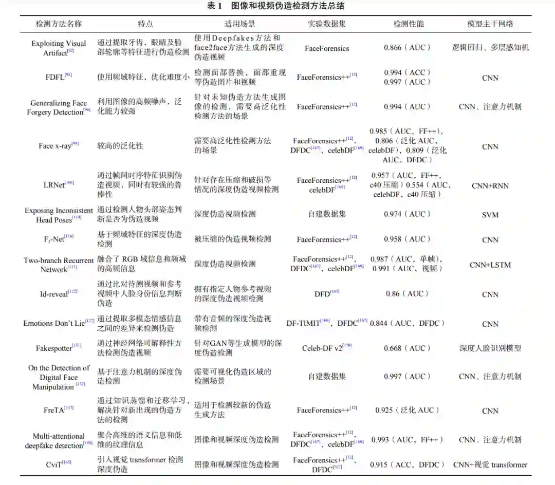 根据是否针对特定的伪造痕迹进行检测,深度 伪造检测可以分为数据驱动的检测方法和针对特定 伪造痕迹取证的检测方法. 表 1 对近年来主流的图像 和视频伪造检测方法的特点和性能等进行了总结.
