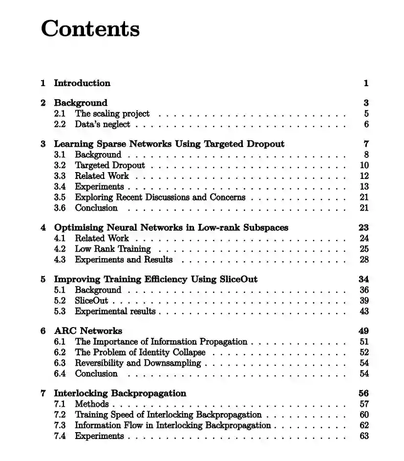 章节的结构是这样的,我们首先介绍专注于提高训练和服务效率的方法以支持模型扩展(第3-7章),然后以专注于数据效率和新数据领域的方法结束以支持数据扩展(第8-10章)。大多数章节都是完全独立的,并引入了独立的技术,然而第六章和第七章是连续撰写的,前者启发了后者的开发,这在前者的结论和后者的引言中进行了讨论。 这一系列工作的意图是通过提供一系列方法,加速引人入胜且连贯的人工智能的发展速度,这些方法可以被利用来使模型和数据的扩展更快、更有效。