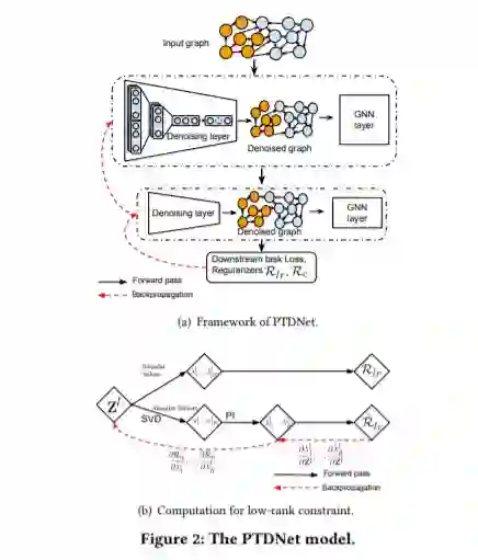 图神经网络(GNN)已被证明是图分析的强大工具。关键思想是沿着给定图的边递归地传播和聚合信息。尽管它们取得了成功,但是,现有的GNN通常对输入图的质量很敏感。真实世界的图通常是噪声和包含任务无关的边缘,这可能导致在学习的GNN模型中泛化性能次优。本文提出一种参数化拓扑去噪网络PTDNet,通过学习丢弃任务无关边来提高GNNs的鲁棒性和泛化性能。PTDNet通过使用参数化网络惩罚稀疏图中的边数来删除与任务无关的边。考虑到整个图的拓扑结构,采用核范数正则化对稀疏图施加低秩约束,以便更好地泛化。PTDNet可以作为GNN模型的关键组件,以提高其在各种任务中的性能,如节点分类和链路预测。在合成数据集和基准数据集上的实验研究表明,PTDNet可以显著提高GNNs的性能,并且对于噪声较大的数据集性能增益更大。