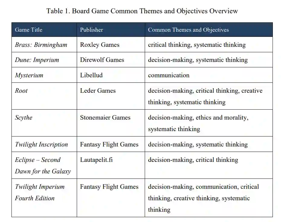 一些开放源码资源提供了流行的、广受好评的棋盘游戏信息,用于分析 PME 课程的共同主题和关键目标。这些资源强调了数十种值得研究的游戏,但由于时间有限,研究范围缩小到了八个项目。所发现的游戏既有简单的,也有耗时一整天的,代表了商业棋盘游戏行业中的一些佼佼者。表 1 列出了这些游戏及其可能有助于教学的主题和目标。