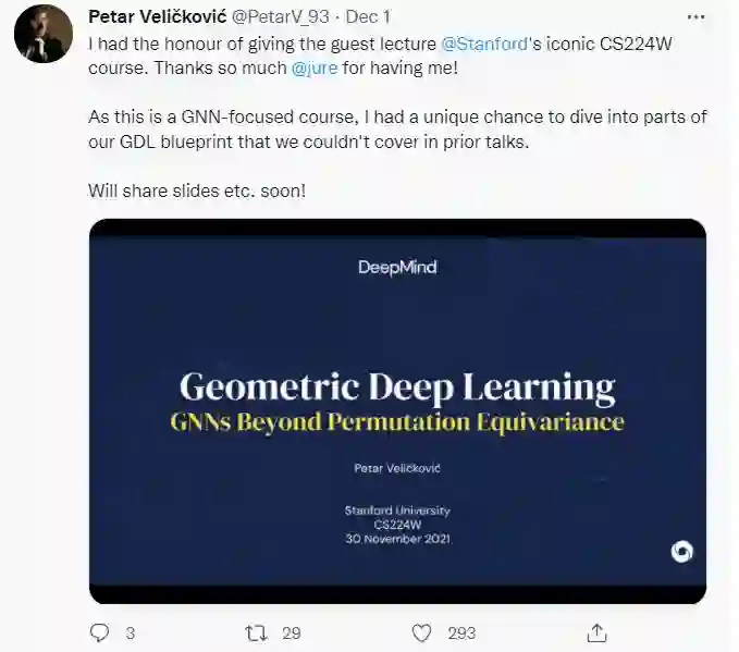 【导读】几何深度学习是当下的研究热点。关于GNN类有何进展?最近斯坦福CS224W课程上,来自DeepMind大牛Petar Veličković进行了关于几何深度学习报告,讲述几何深度学习下GNN的相关特性,值得学习!