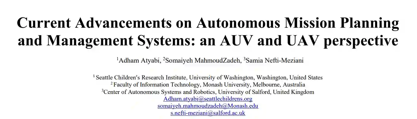 硬件技术的进步使得复杂的软件得以更多的整合,引发了无人平台(UV)的发展和使用,并减轻了对机载智能的限制。因此,UV现在可以参与更复杂的任务,环境条件的不断变化需要更高水平的情景响应。本文是对UV任务规划和管理系统的介绍,旨在强调自主水下和空中飞行器领域的一些最新发展,此外还强调了一些可能的未来方向,并讨论了学到的经验教训。在这项研究中,对UV的自主性评估以及自主性的不同方面,如态势感知、认知和决策,进行了全面调查。本文分别解释了仿人系统和自主系统的性能,并强调了人类在UV操作中的作用和影响。