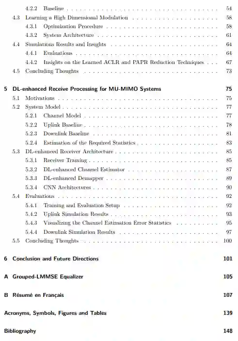 首先,我们描述了一个基于神经网络(NN)的区块策略,其中一个NN被优化以取代通信系统中的一个或多个区块(s)。我们应用这一策略来介绍一个多用户多输入多输出(MU-MIMO)的检测器,它建立在现有的基于DL的架构之上。关键的动机是用一个超网络取代对每个新信道实现的再训练需求,该网络为底层DL检测器生成优化的参数集。其次,我们详细介绍了一个端到端的策略,其中发射器和接收器被建模为NN,被联合训练以最大化可实现的信息速率。这种方法可以进行更深层次的优化,如在满足峰均功率比(PAPR)和相邻信道泄漏比(ACLR)约束的情况下,设计实现高吞吐量的波形。最后,我们提出了一种混合策略,在这种策略中,多个DL组件被插入到一个传统的架构中,但经过训练,以优化端到端的性能。为了证明其优点,我们提出了一个DL增强的MU-MIMO接收器,与传统接收器相比,它既能实现较低的误码率(BER),又能保持对任何用户数量的扩展。