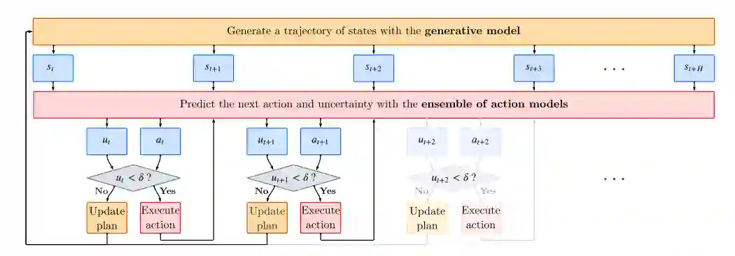 图 1:生成式模型生成状态轨迹,行动模型计算初始行动。只要不确定性保持在预定阈值以下,策略就会持续预测并执行后续行动。