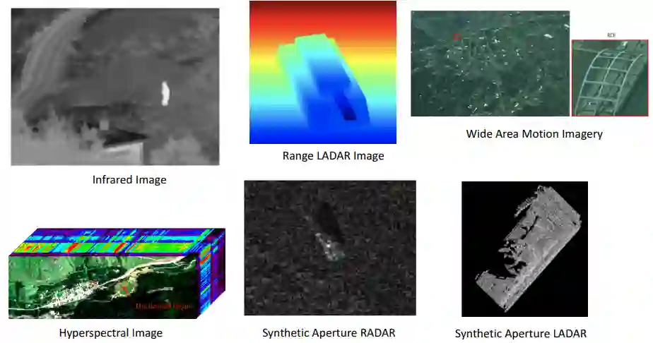 为了收集ATR数据,我们利用了各种传感方式。这些模式包括合成孔径雷达(SAR)、合成孔径声纳(SAS)、3-D激光雷达、超光谱成像(HSI)、广域运动图像(WAMI)、激光测振和红外图像。这些模式的例子见图1.2。