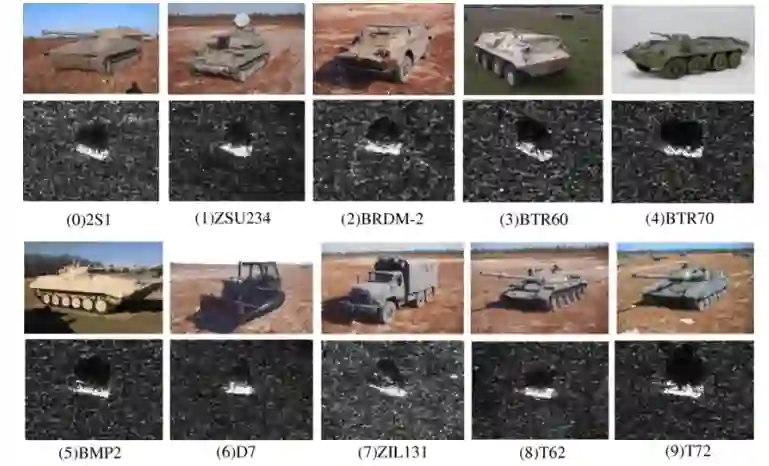 图2.1: MSTAR目标的例子和目标的照片。MSTAR图像包含目标、背景和阴影信息。