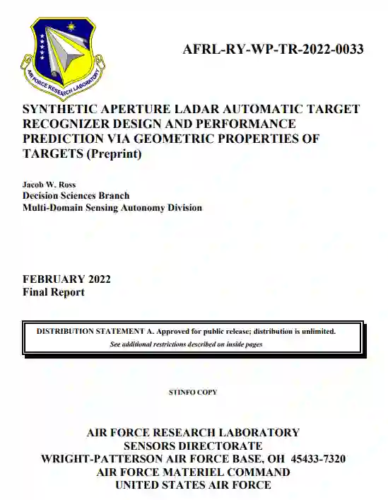 合成孔径激光雷达(SAL)与合成孔径雷达(SAR)有几个不同的现象,使其成为自动目标识别(ATR)有希望的候选者。SAL的漫射性质导致目标上有更多的像素。光学波长提供厘米级的分辨率,其孔径基线比SAR基线小10000倍。虽然漫反射散射和光学波长有一些优势,但也有一些挑战。与SAR相比,SAL的漫反射性质导致了更明显的斑点效应。光学波长更容易受到大气噪声的影响,导致形成的图像失真。虽然这些优点和缺点在理论上被研究和理解,但还没有被付诸实践。本论文旨在量化从镜面SAR切换到漫反射SAL对算法设计的影响。此外,鉴于CAD模型的几何和物理特性,提出了一种性能预测和模板生成的方法。这种方法不依赖于形成图像,并减轻了生成多个斑点场和冗余光线追踪的计算负担。
