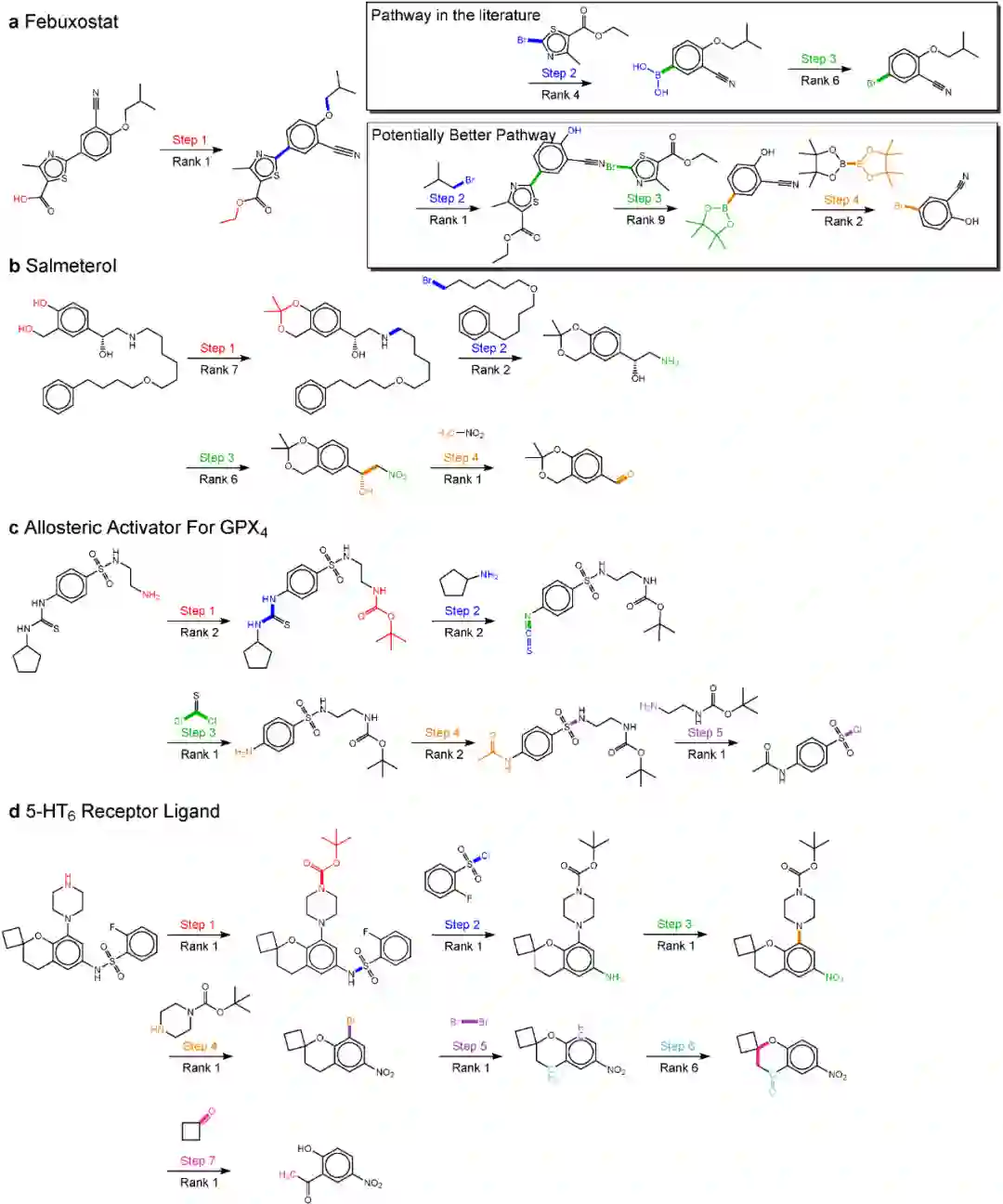 多步逆合成反应预测 作者通过迭代使用基于R-SMILES训练的逆合成预测模型,成功地复现了多种分子在文献中报告的逆合成路径,进一步验证了方法的有效性。其中对于抗痛风药非布索坦,作者除了复现了文献中报告的逆合成路径之外,还通过模型预测,提出了一条潜在的新的合成路径,如图4a所示。作者分别从产率和价格上分析了这两条路径:(1)作者指出第二条路径中使用的硼酸酯,相比于第一条路径的硼酸有更好的热稳定性,且硼酸频哪醇的引入可以有效地减少副反应的产生,即可以有效地提高产率;(2)在Reaxys数据库中可以发现,第二条路径的原材料相比于第一条路径要便宜得多,因此作者认为他们的方法可能为非布索坦提出了一条更好的合成路径。