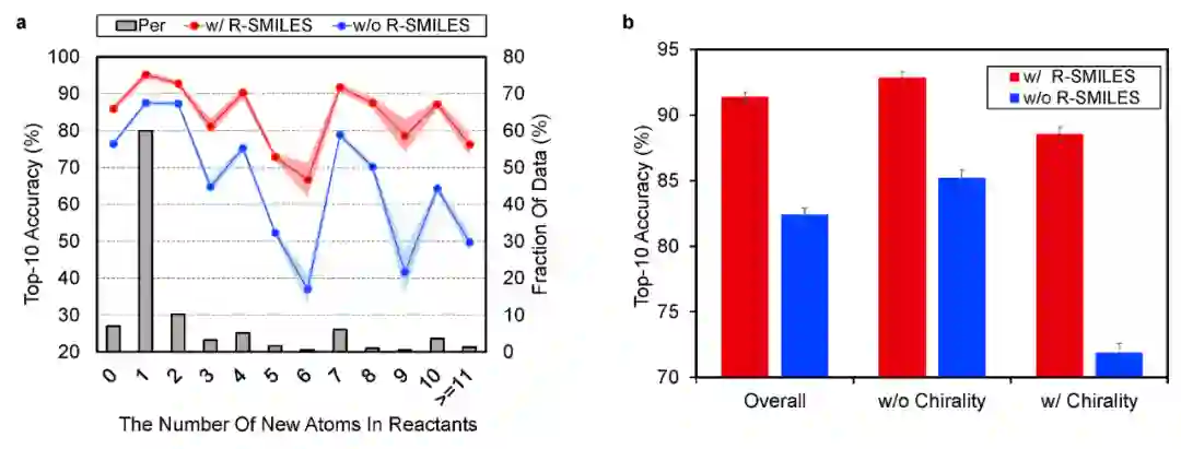 图3. 在复杂反应上的top-10逆向反应预测正确率。(a) 根据新增原子数的正确率;(b)在反应有无手性时的正确率。