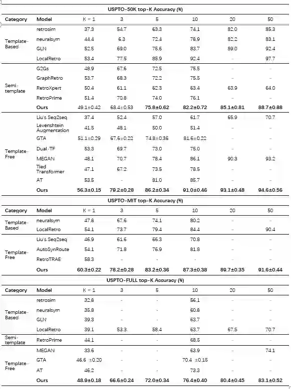 表3. 在USPTO-MIT数据集上R2P阶段的top-K正确率。