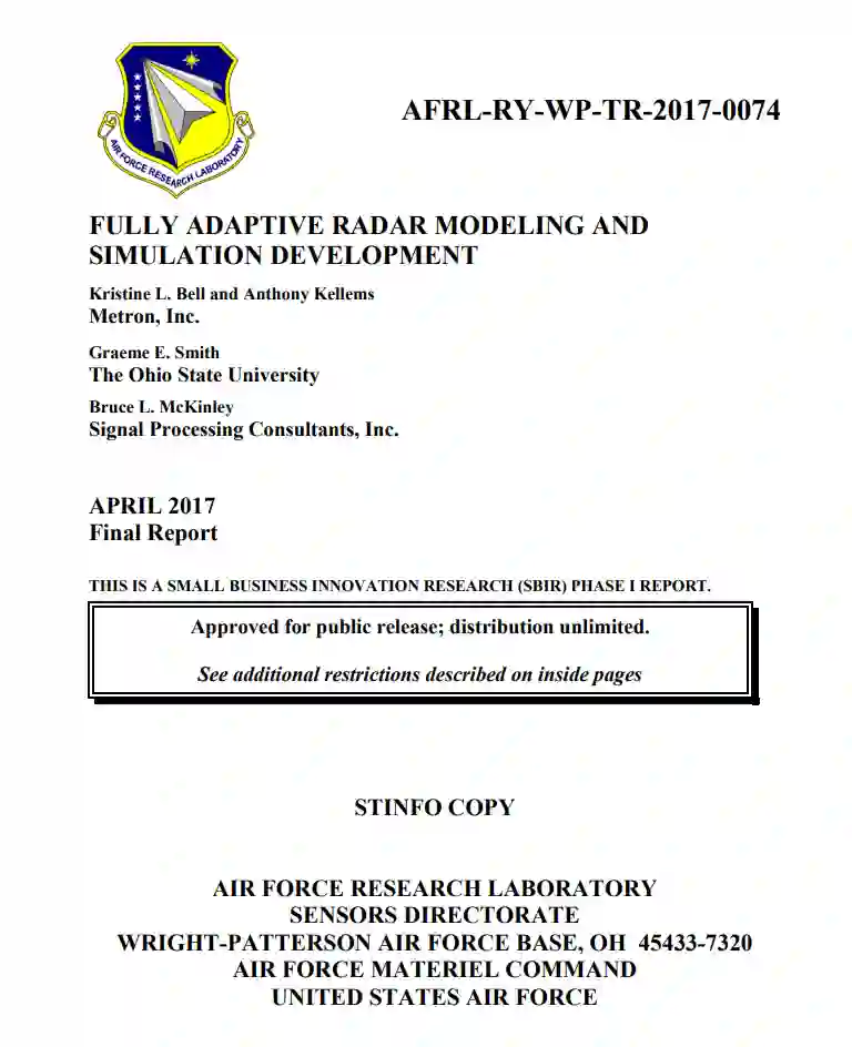认知方法在几乎所有方面可提高现有雷达的性能,这导致了近年来研究的激增,空军雷达建模和仿真(M&S)工具的一个关键差距是缺乏针对分布式全适应雷达(FAR)系统的全面、动态分布式雷达情景生成能力。截至2015年初,所有的研究都是在理论上推进概念,并通过模拟检验其性能,或者最多使用预先录制的数据。没有关于实验验证概念的报告,主要是因为还没有开发出测试它们的必要硬件。然而,为了确定应用认知处理方法的真正性能潜力,这一步骤是至关重要的。为了解决这个问题,俄亥俄州立大学(OSU)电子科学实验室(ESL)的认知传感实验室(CSL)与Metron公司、空军研究实验室(AFRL)和空军科学研究办公室(AFOSR)一起,已经开始了一项研究计划,从分析和实验上开发和检验认知雷达处理概念。